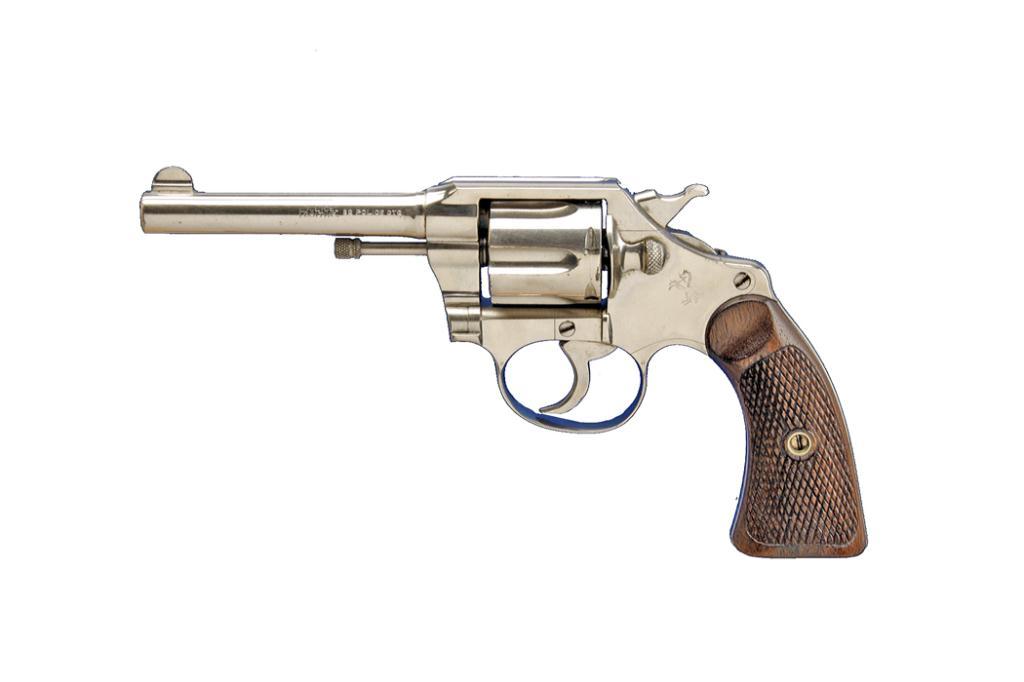 Colt Police Positive Cal .32 Police SN:207303, DA 6 shot revolver. Nickel finish, wood checkered grips, 4" barrel, fixed sights, good bore and action. Condition: Very good with a small amount of thinning and flaking to the nickel and wear to the gripSN:207303, DA 6 shot revolver. Nickel finish, wood checkered grips, 4" barrel, fixed sights, good bore and action. Condition: Very good with a small amount of thinning and flaking to the nickel and wear to the grips.
