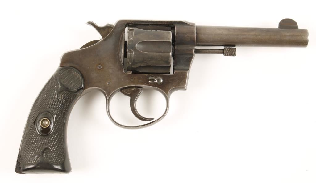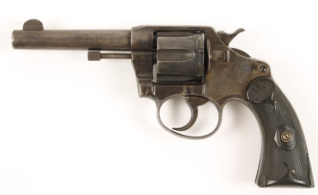 Blued double-action 6-shot revolver with 4" barrel. Finish has faded to a mottled grey/black patina with scratches and a few dings. Bore is shiny with good rifling and an area of pitting. Chambers are clear. Black hard rubber grips have chips out and a repaired break. Function is very good with tight lock-up. Condition is fair. *Modern Firearm*