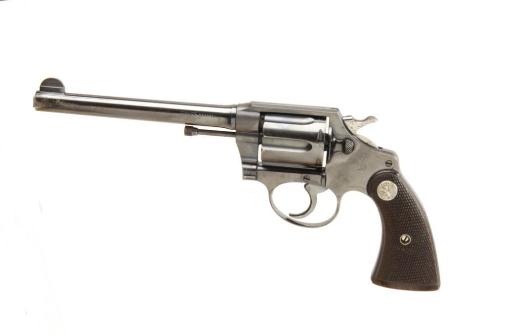 Colt Police Positive Cal .38 SN:358228 Pre War II, six shot, 6" barrel, original walnut grips and Colt medallions, 80-90% and is in excellent condition, the barrel is marked "Second Model" "C", pat Oct 5, 1928, mfg 1932.Pre War II, six shot, 6" barrel, original walnut grips and Colt medallions, 80-90% and is in excellent condition, the barrel is marked "Second Model" "C", pat Oct 5, 1928, mfg 1932.