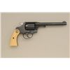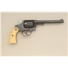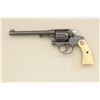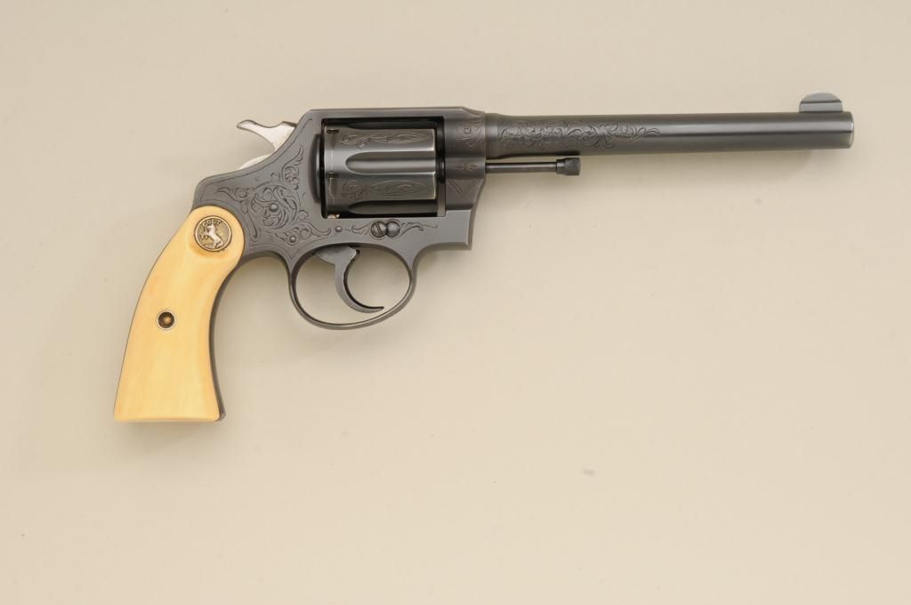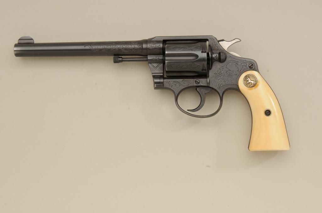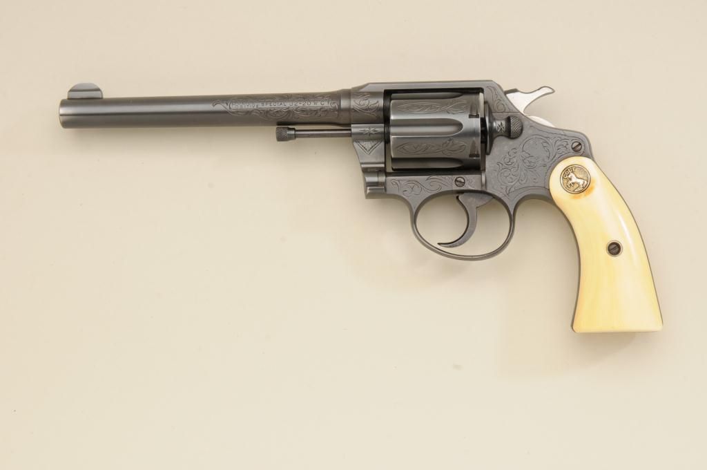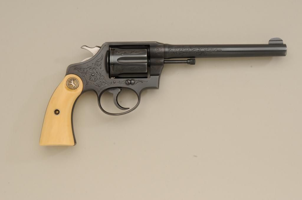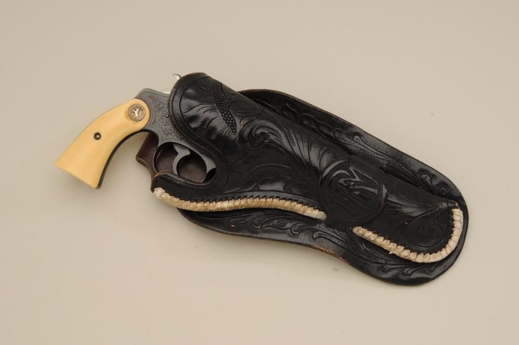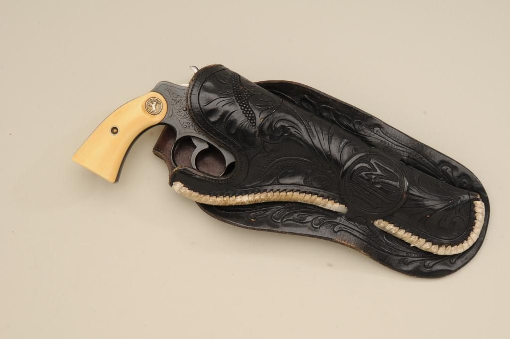 Colt Police Positive DA revolver, .32-20 W.C.F. cal., 6” barrel, engraved, re-blued finish, ivory medallion grips, #331457. This gun is in overall very good condition retaining the majority of the re-bluedfinish, the engraving appears to be factory, the action is crisp, the barrel address clear, the bore good and the grips very good; accompanied by a Heiser tooled single loop holster with initials “IRM” in goodcondition; would be good to send for a factory letter to the Colt Historian. Est.: $900-$1,800.