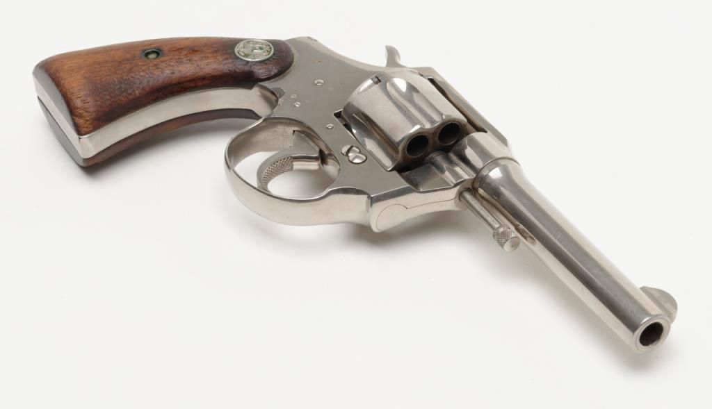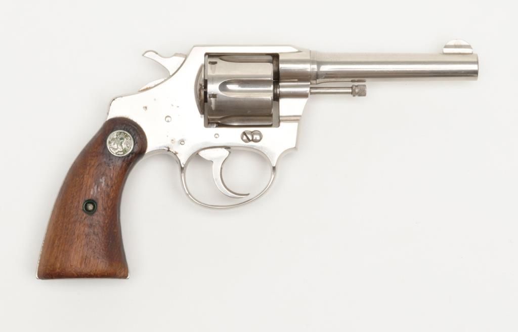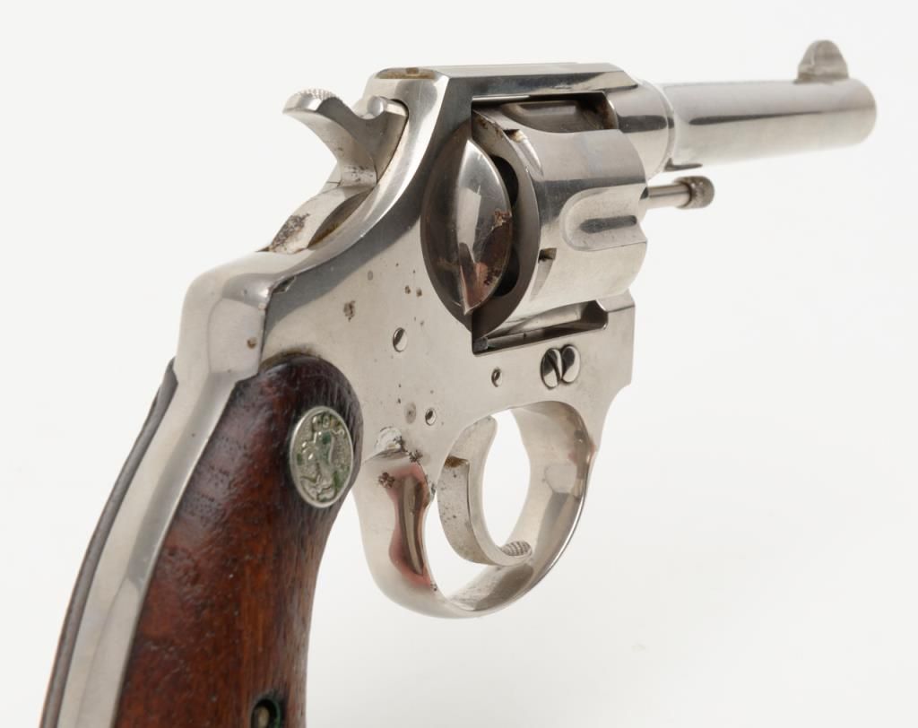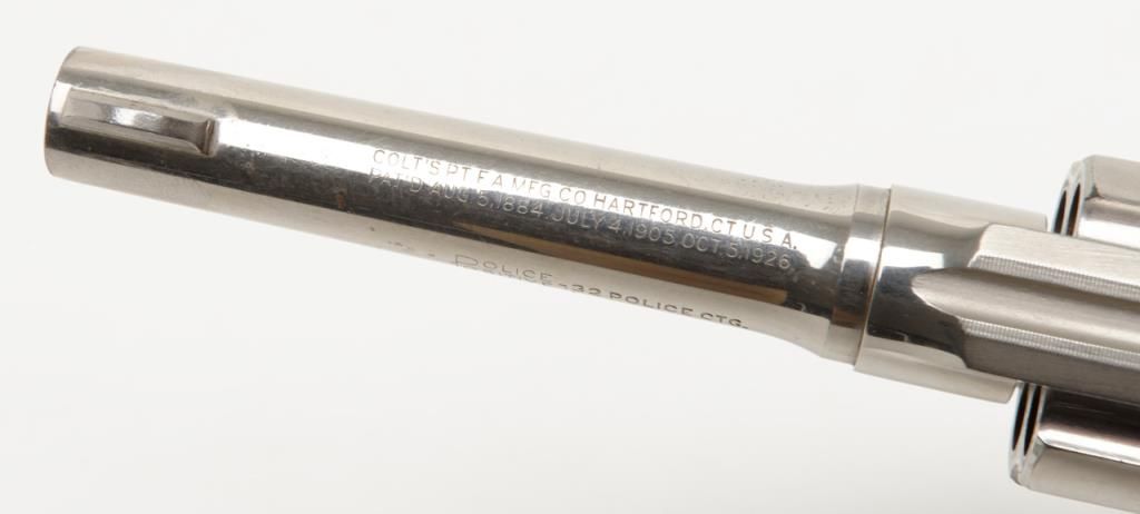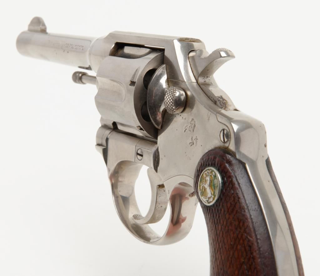 Colt Police Positive DA revolver, .32 Police cal., 4” barrel, nickel finish, checkered wood medallion grips, #323810 in overall very good to near fine condition showing the majority of its original finish, very good bore, crisp action,very good markings, good grips, worn from carry, particularly on the right grip (as would be expected if carried by a right handed individual). Accompanied by a very interesting 13 page article and copy of notarized affidavit signed by ThomasMichael McGaffey entitled Dad and Dillinger, dated November 1, 2013 wherein Mr. McGaffey, in summary, relates an account his father told him of an incident that occurred sometime in late November, 1933, when as a police officer inMilwaukee, Wisconsin, he and his partner were in a “stake out” and beginning to wrap it up as the suspect had not shown up. His partner had returned to their vehicle with their two Winchester Model ’97 shotguns when the suspect and two other men“burst” into the room. Reportedly, Mr. McGaffey’s father drew this Colt, identifying himself as a police officer and was shot in the left arm and abdomen. He returned fire hitting one of the shooters and reported the third man in the room