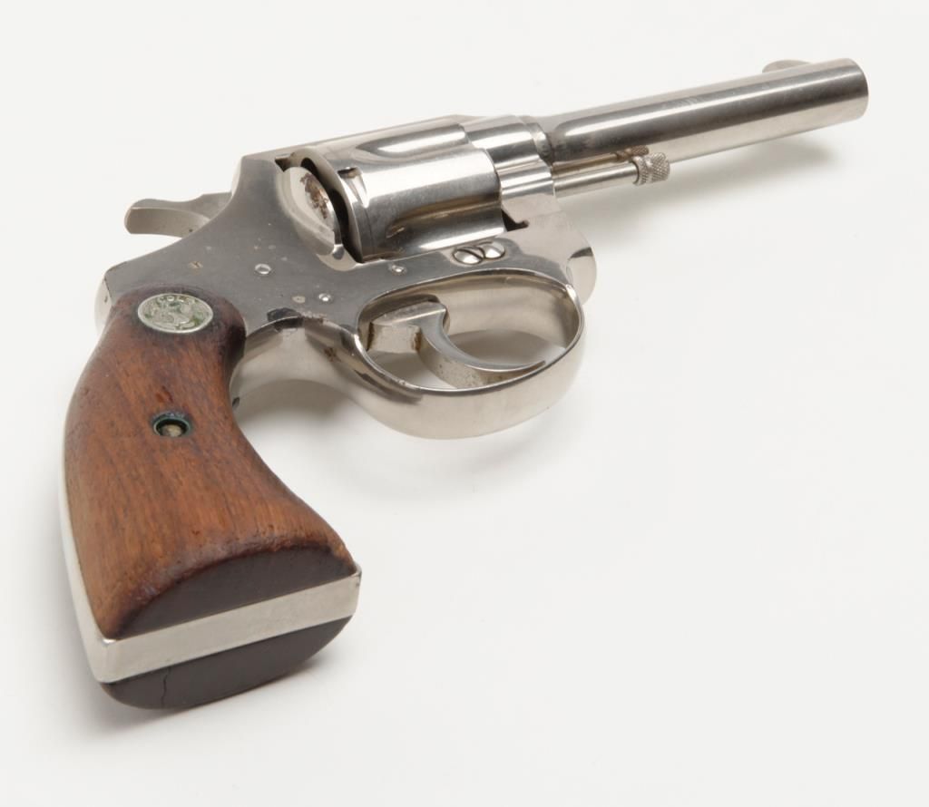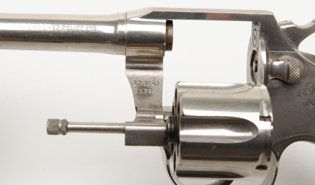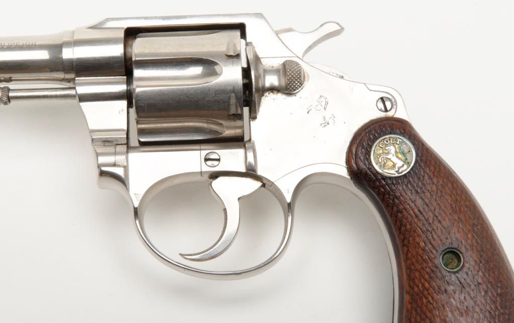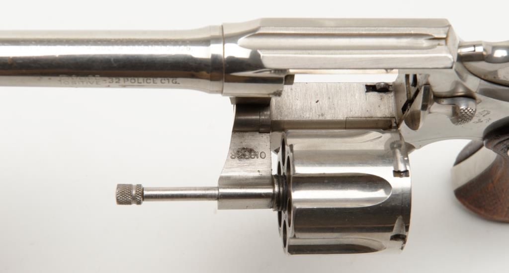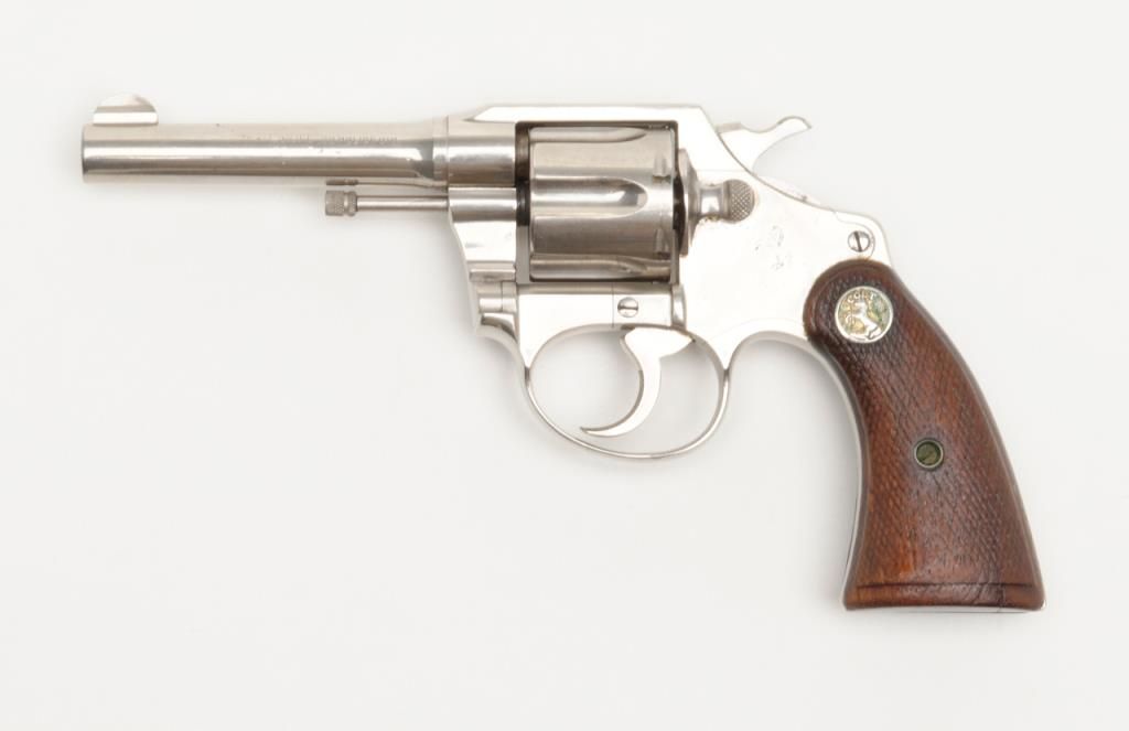 Colt Police Positive DA revolver, .32 Police cal., 4” barrel, nickel finish, checkered wood medallion grips, #323810 in overall very good to near fine condition showing the majority of its original finish, very good bore, crisp action,very good markings, good grips, worn from carry, particularly on the right grip (as would be expected if carried by a right handed individual). Accompanied by a very interesting 13 page article and copy of notarized affidavit signed by ThomasMichael McGaffey entitled Dad and Dillinger, dated November 1, 2013 wherein Mr. McGaffey, in summary, relates an account his father told him of an incident that occurred sometime in late November, 1933, when as a police officer inMilwaukee, Wisconsin, he and his partner were in a “stake out” and beginning to wrap it up as the suspect had not shown up. His partner had returned to their vehicle with their two Winchester Model ’97 shotguns when the suspect and two other men“burst” into the room. Reportedly, Mr. McGaffey’s father drew this Colt, identifying himself as a police officer and was shot in the left arm and abdomen. He returned fire hitting one of the shooters and reported the third man in the room