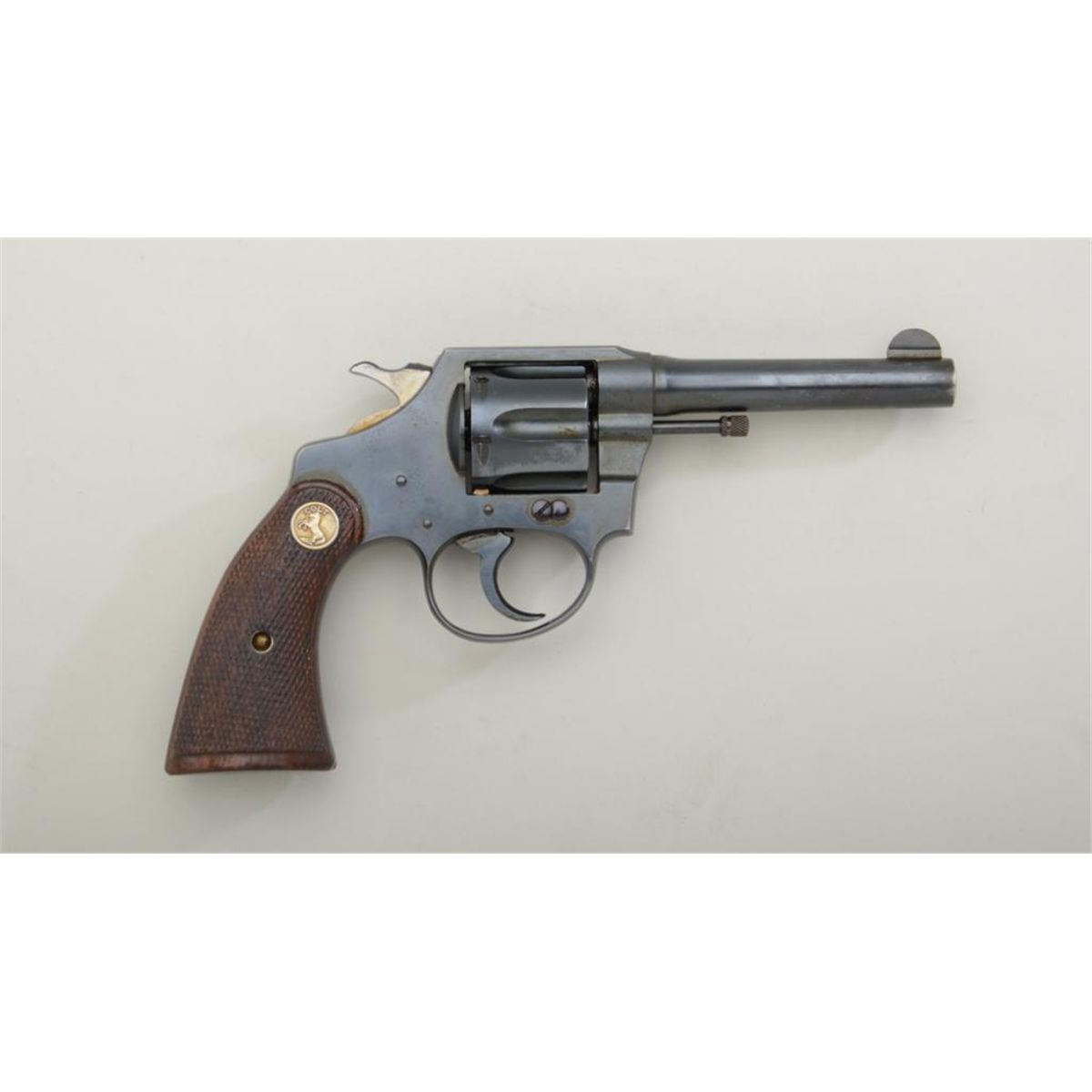 Colt Police Positive DA revolver, .38 cal., 4” barrel, blue finish, checkered medallion wood grips, #375059. This gun is in overall excellent condition showing approx. 98% original finish with just some slight muzzlewear, crisp action, sharp markings, fine bore, excellent grips. Est.: $250-$450.