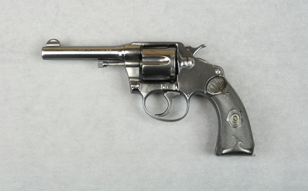 Colt Police Positive DA revolver, .38 cal.,  4” barrel, old re-blue finish, checkered  black Colt hard rubber grips, #47057. This  gun is in overall good condition showing the  majority of its old re-blue finish, goodaction, fair bore, grips show old losses at  the rear toes of each grip.  Est.:   $125-$250.