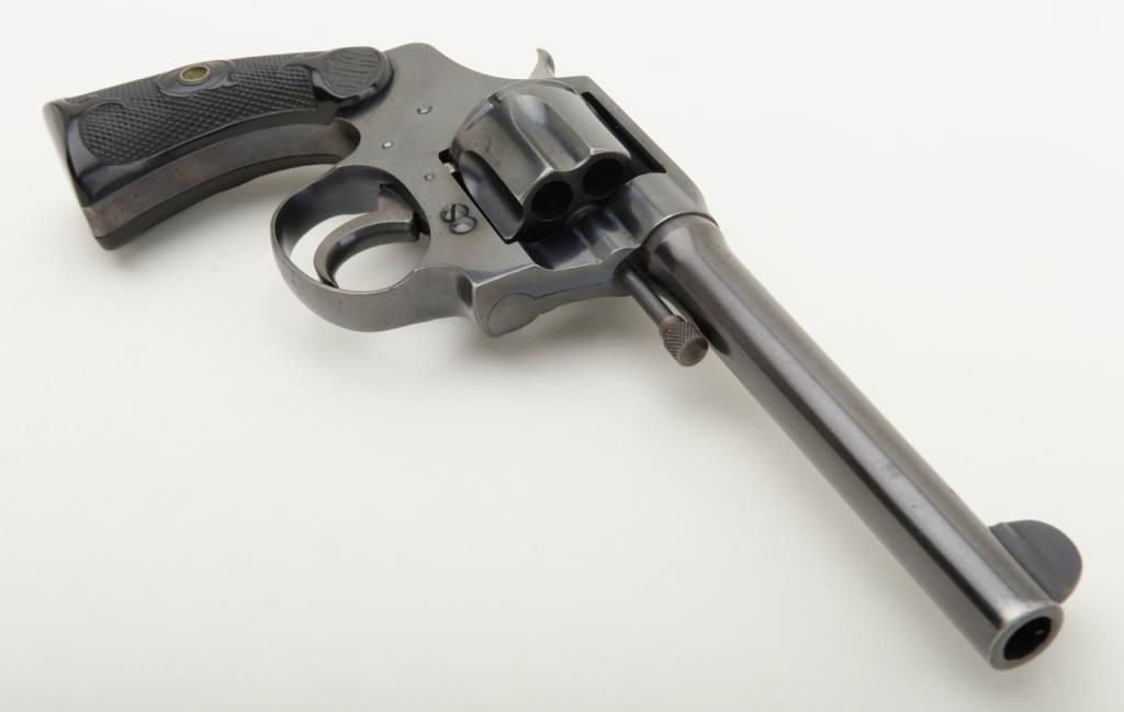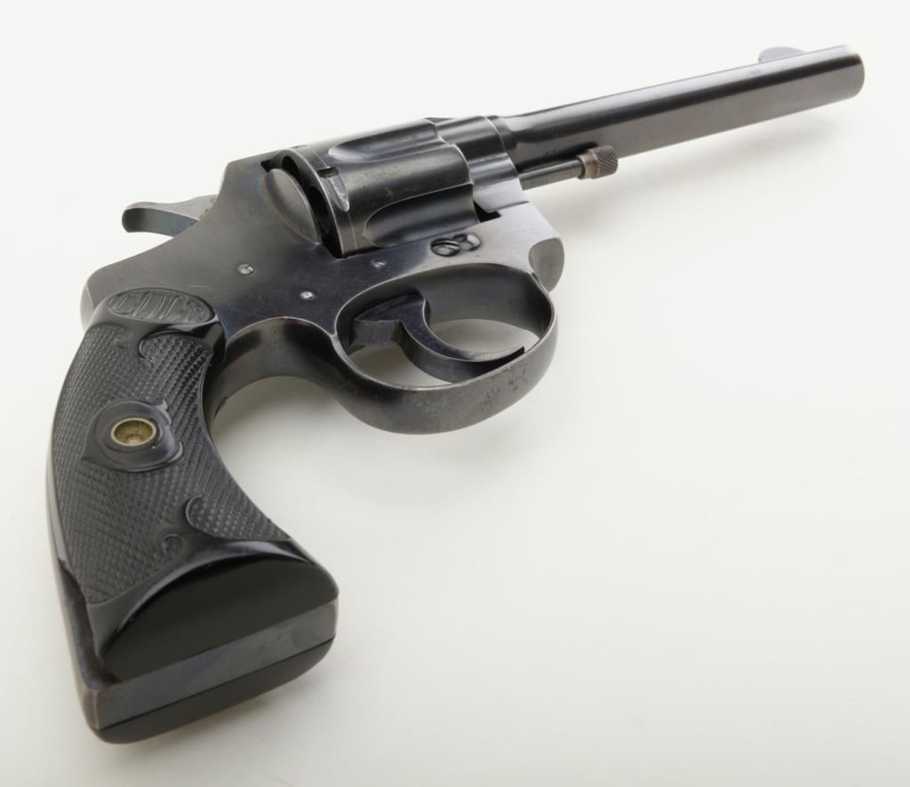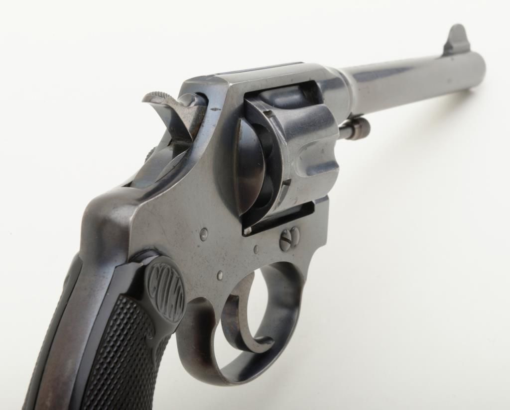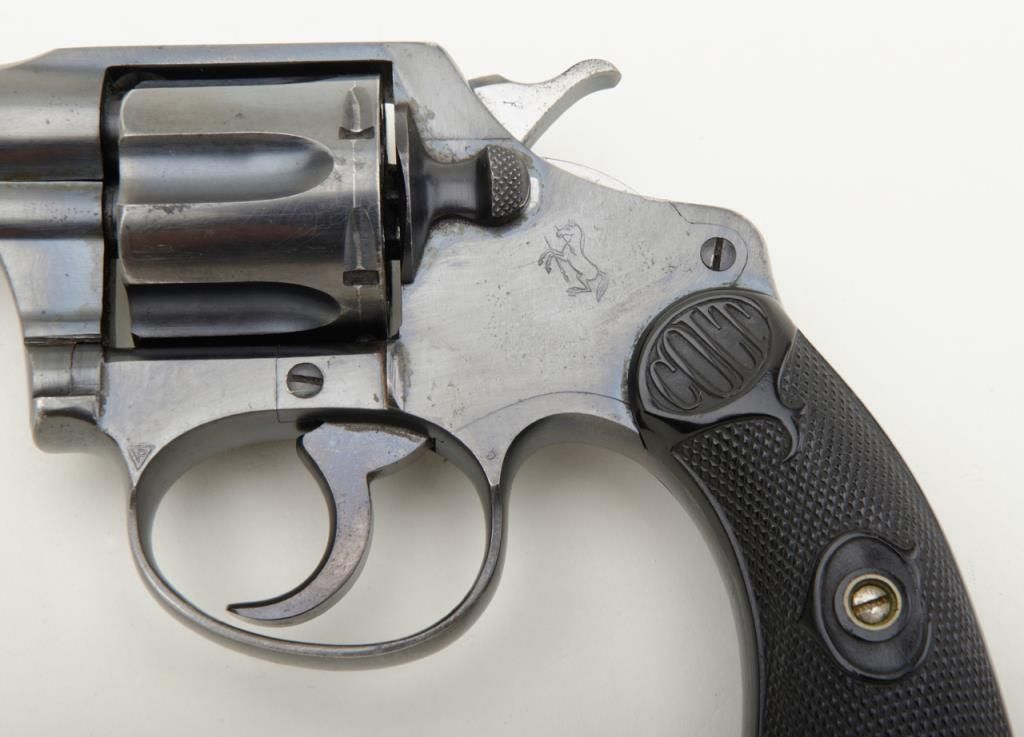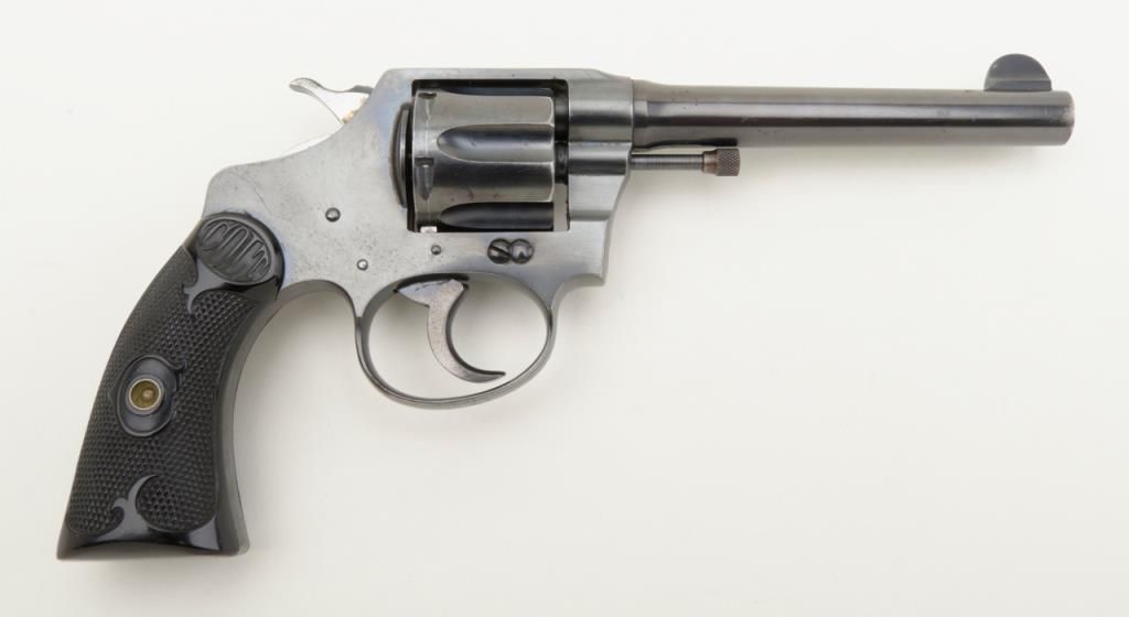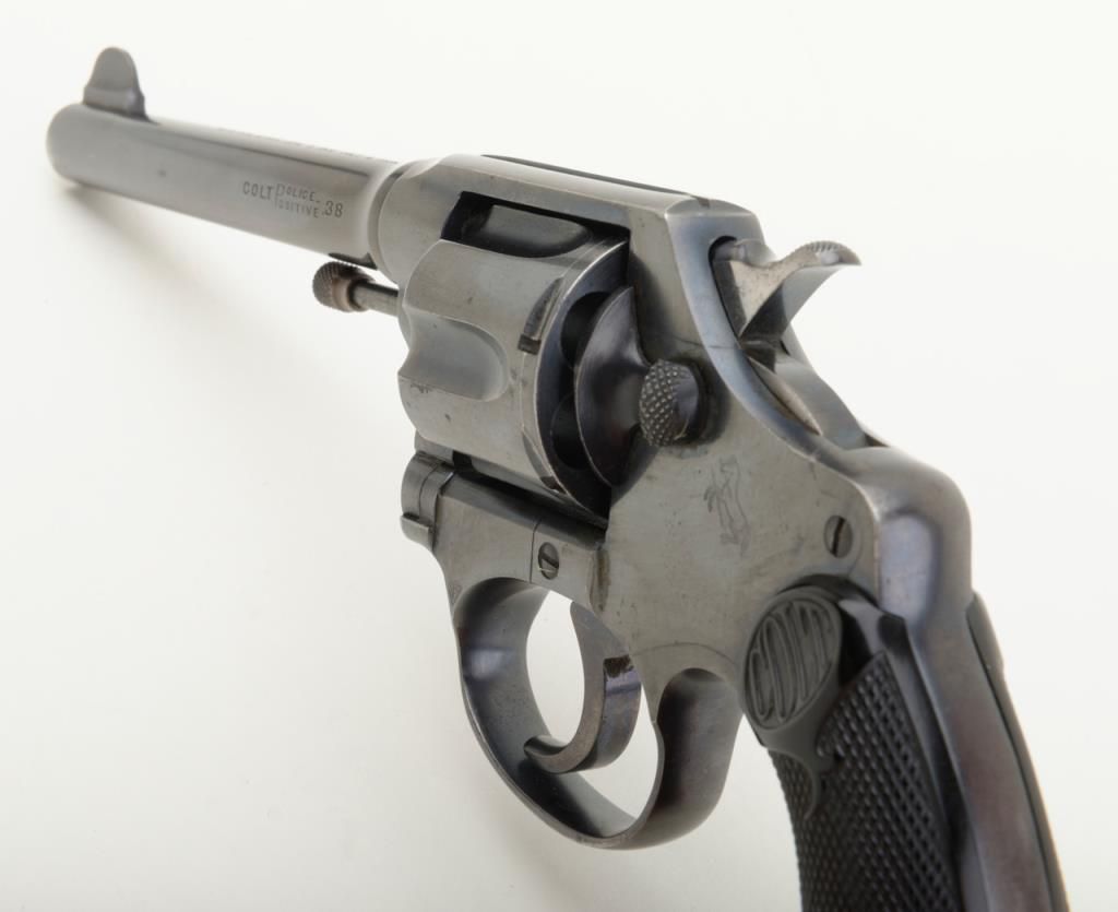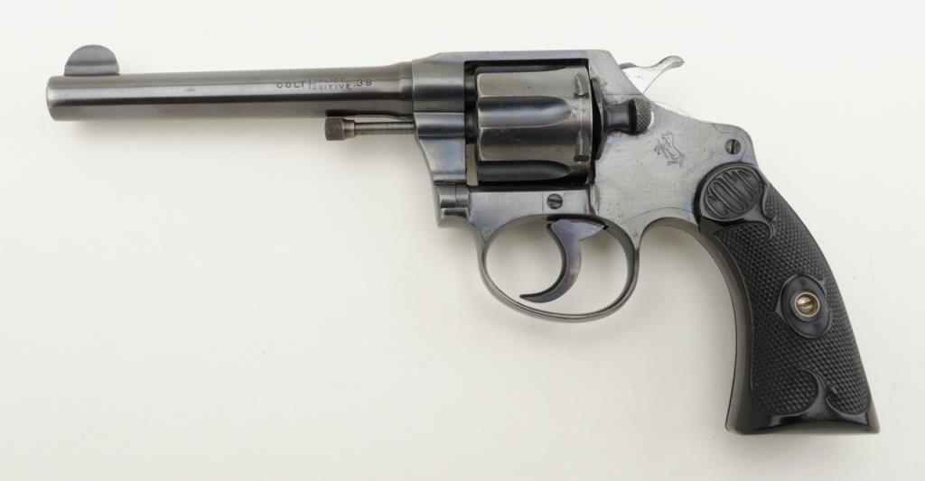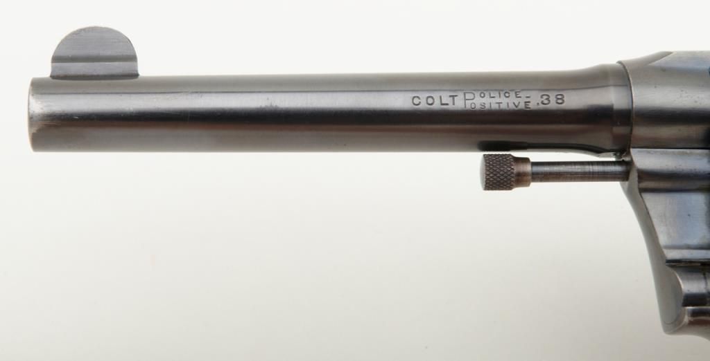 Colt Police Positive DA revolver, .38 cal., blue finish, checkered black hard rubber grips, #95101 in very good condition showing majority of blue finish, very good bore, action, markings and grips with right grips showing old chip on bottom rear toe. (C&R/PPT). Est.: $150-$300.