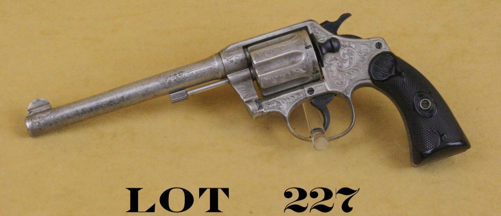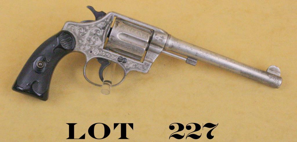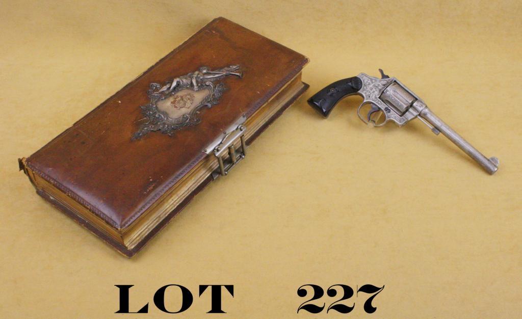 Colt Police Positive DA revolver, 6” barrel, scroll engraved with back strap inscribed “Salitrera Antogagasta”, silvery finish, checkered black Colt hard rubber grips, #183069. This gun shows some light tomoderate erosion and surface pitting and some slightly heavier areas of pitting on the sides of the barrel from being restored long ago; worn bore, fair action, good grips. The revolver is contained within apartition-style red velveteen-lined old original “to the period” casing which shows a very fancy Art Nouveau plaque at its top and an elaborate hinge, which is engraved with what may be a French maker’s hallmark. Theplaque is inscribed with initials and silver-plated over brass. The balance of the casing is a book-type leather casing. The inscription on the pistol has to do with mining in Chile. Est.: $3,500-$5,500.