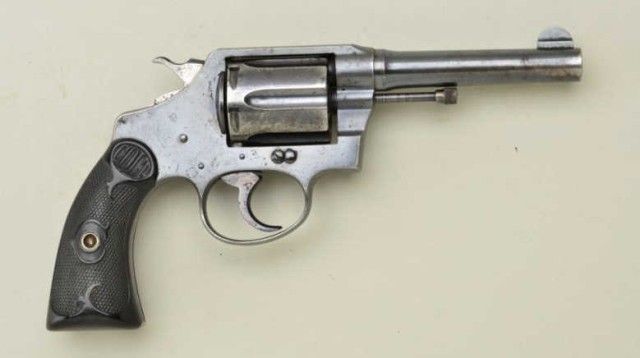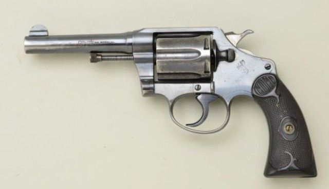 Colt Police Positive DA revolver, factory inscribed “W.F. & Co.” on butt strap, .38 Special cal., 4” barrel, blue finish, checkered black hard rubber grips, #149841. This gun is in overall very good + conditionshowing approx. 60% original finish, good bore, crisp action and sharp markings; grips are overall good with an old loss at the rear left toe; the type of revolver carried by Wells Fargo expressmen, agents or detectives. Est.: $500-$1,000.