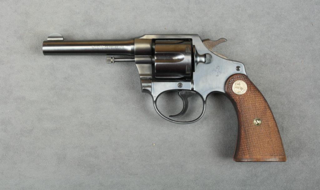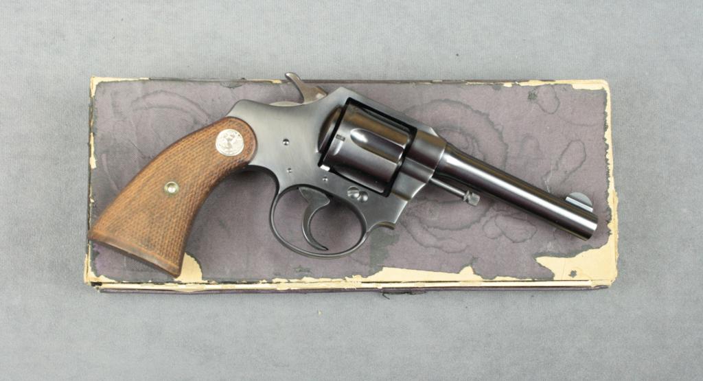 Colt Police Positive DA revolver with original brown covered cardboard box and correct end label, .32 Police cartridge, 4” round barrel, blue finish, checkered medallion wood grips, #384363. This gun is in overall like new condition showing little handling; fine bore, action, markings and approx. 99%+ original blue; excellent grips; box is overall fair to good with some staining, scuffing and separated front andside ends to lid but they remain with the lot; cleaning brush and instructions included along with an original sales receipt from the Kerr Sport shop in Beverly Hills, CA. dated Nov. 2, 1938 where the gun originallysold for $28.27. The box would improve with some careful restoration. Est.: $300-$500.