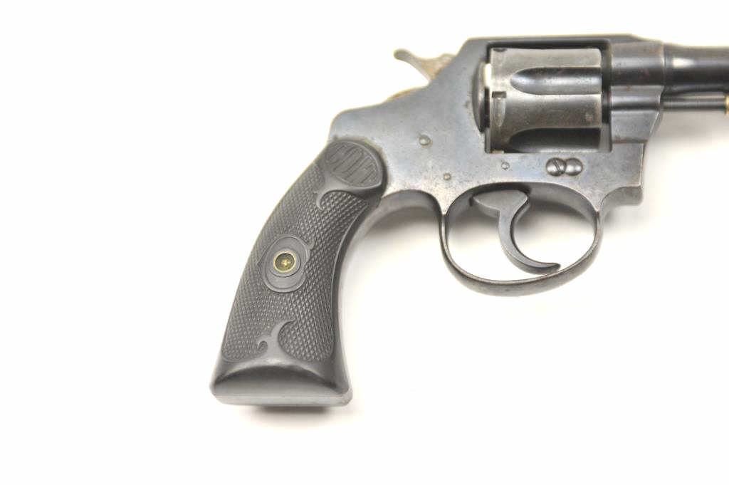 Colt Police Positive Double Action revolver in .38 caliber with a 4” barrel and early hard rubber grips, S/N 89056. 50%-70% original blue with some rust and erosion needing cleaning. Good markings and goodgrips. Tight action and good bore. Estate consigned. Would improve with cleaning and T.L.C. (C&R/PPT) Est.: $200-$400