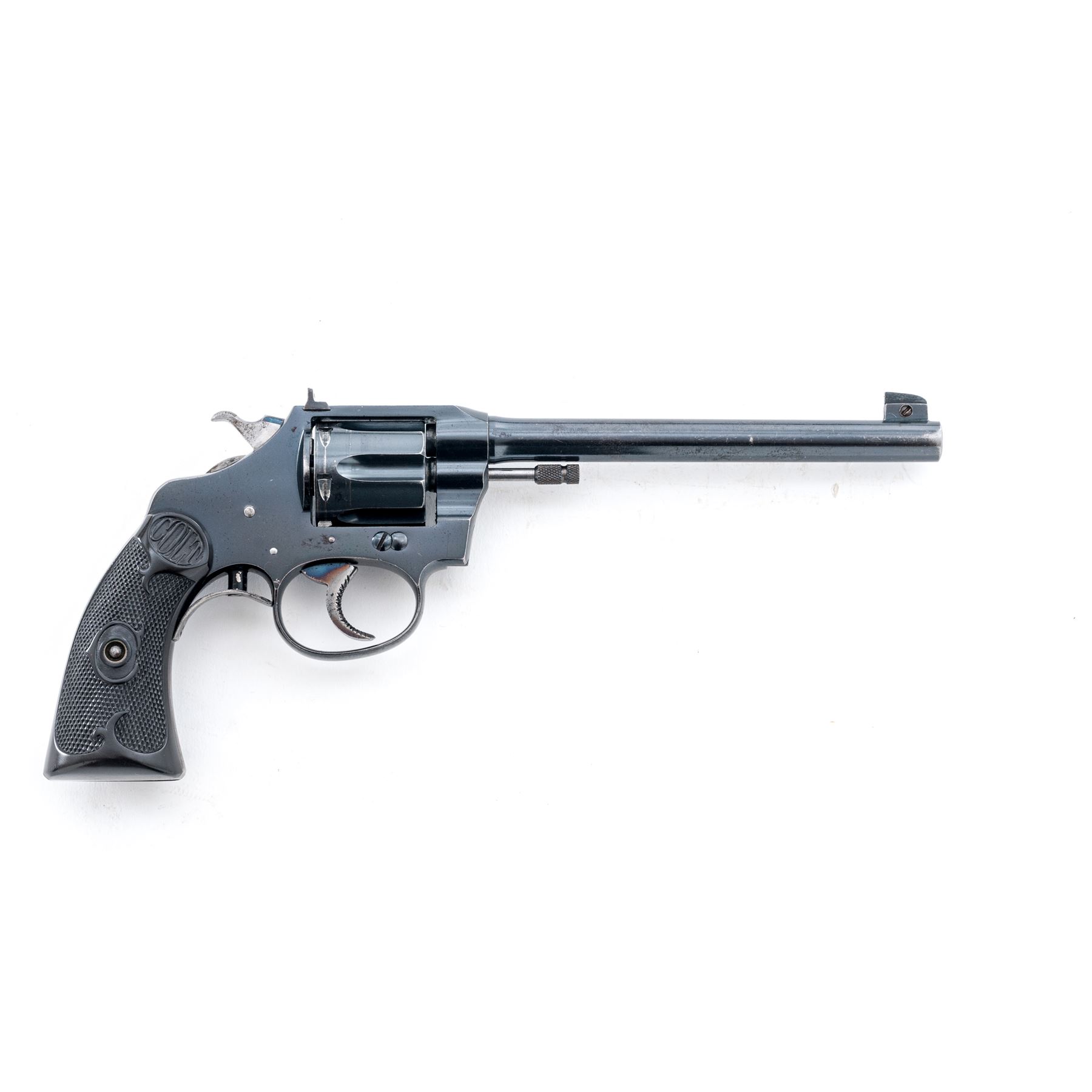 Colt Police Positive Flat-Top Target Double Action Revolver, #7824, .22 WRF cal., 6'' barrel, high polish blue finish, factory checkered hard rubber grips, elevation adjustable front and windage adjustable rear sight. Mfg'd 1912. Condition is near excellent as modified, with gunsmith made grip adapter, checkering to face of trigger. Approx. 92% original blue is retained, with most of the wear as thinning to sides of barrel, and thinning and toning to front and backstrap. Action remains light and crisp, bore is bright. Est.: $450-$650. (C&R/PPT)