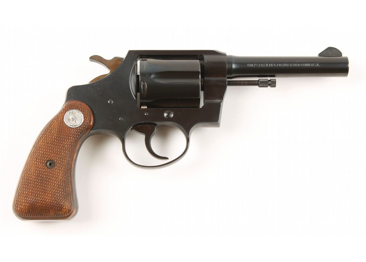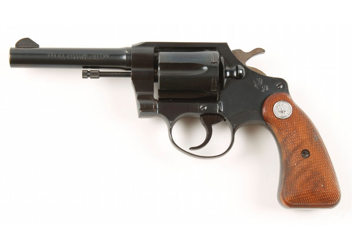 Double action six shot revolver made in 1965 with 4" barrel. Blued finish, checkered wood grips with silver medallion and fixed sights. Excellent bore and action.