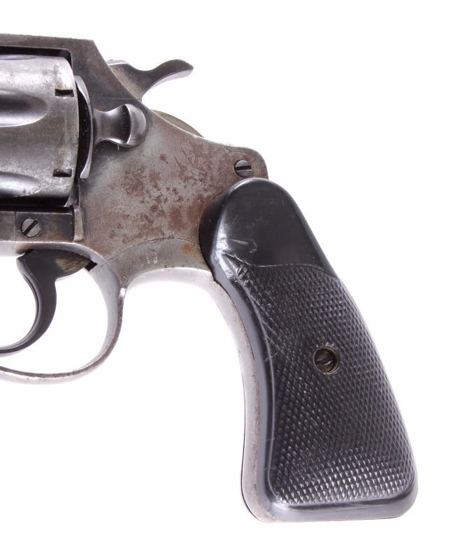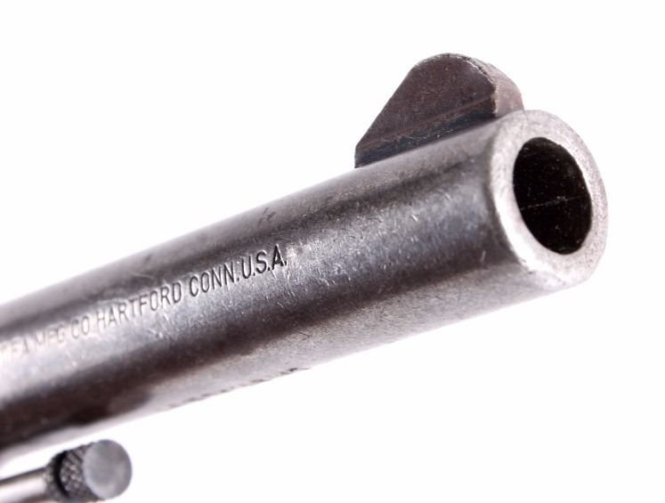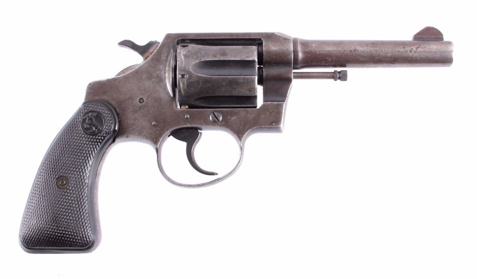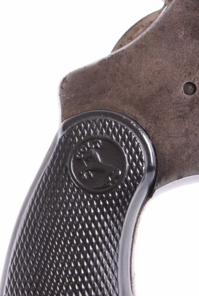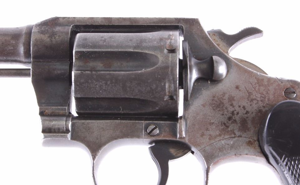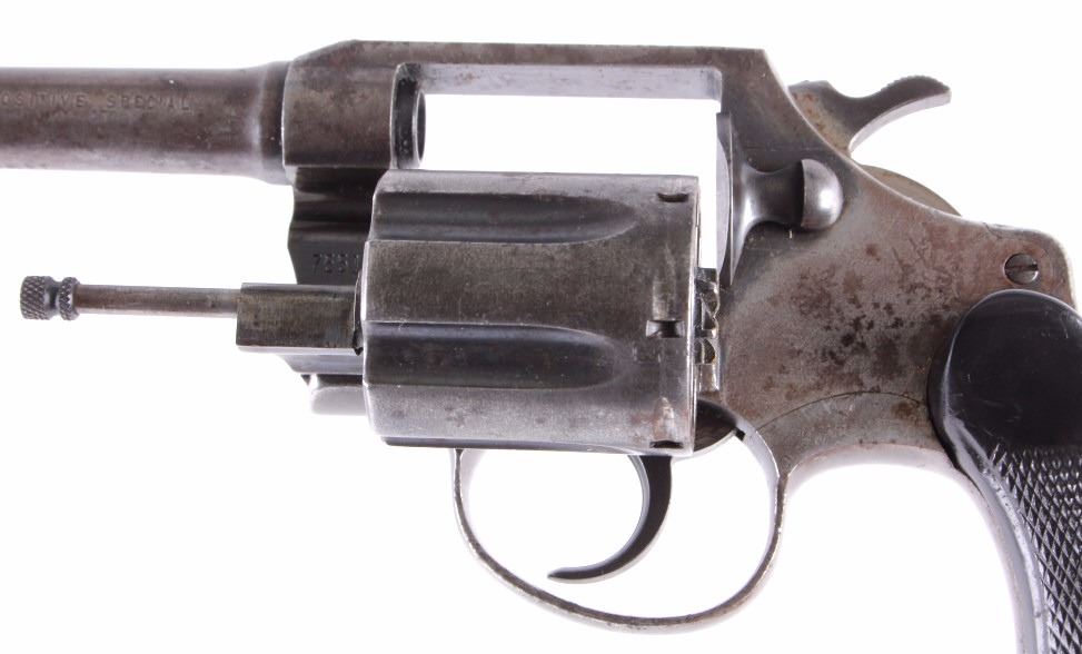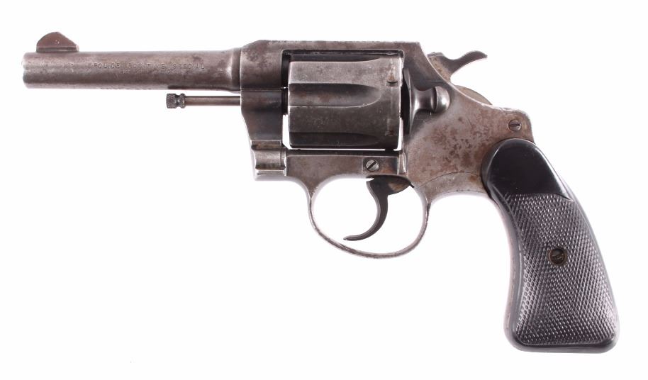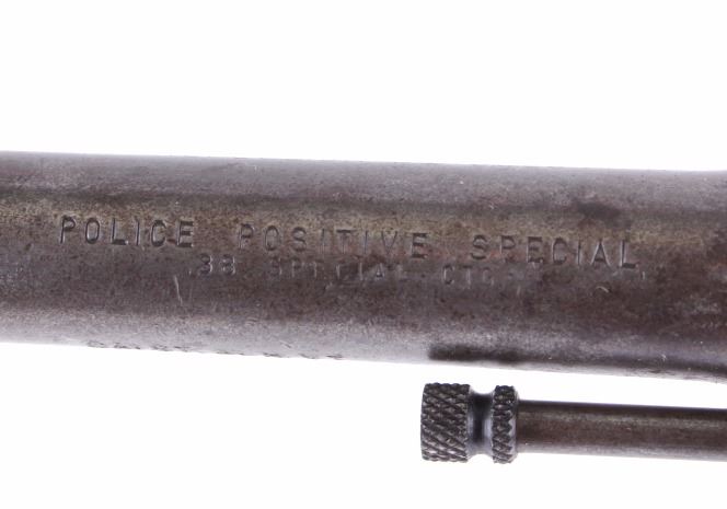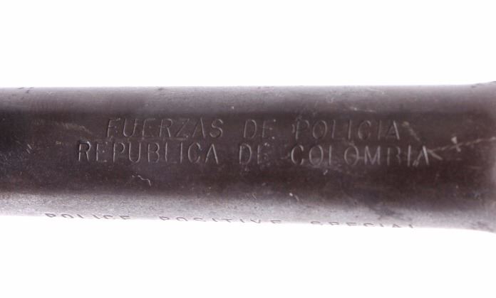 This is a Colt Model Police Positive Special double action revolver in a 38 Special caliber. The revolver shows a blue finish with loss and the original hard rubber grips. This has a 4 inch round barrel. The barrel is marked "Police Positive Special .38 Special CTG" and "Colt's Pt. F.A. Mfg. Co. Hartford Conn. U.S.A.". The top of barrel is marked "Fuerzas de Policia Republica de Colombia". The revolver has a serial number of 755191 and was manufactured in 1960. Curio & Relic Handgun FFL Transfer or NICS Background required.