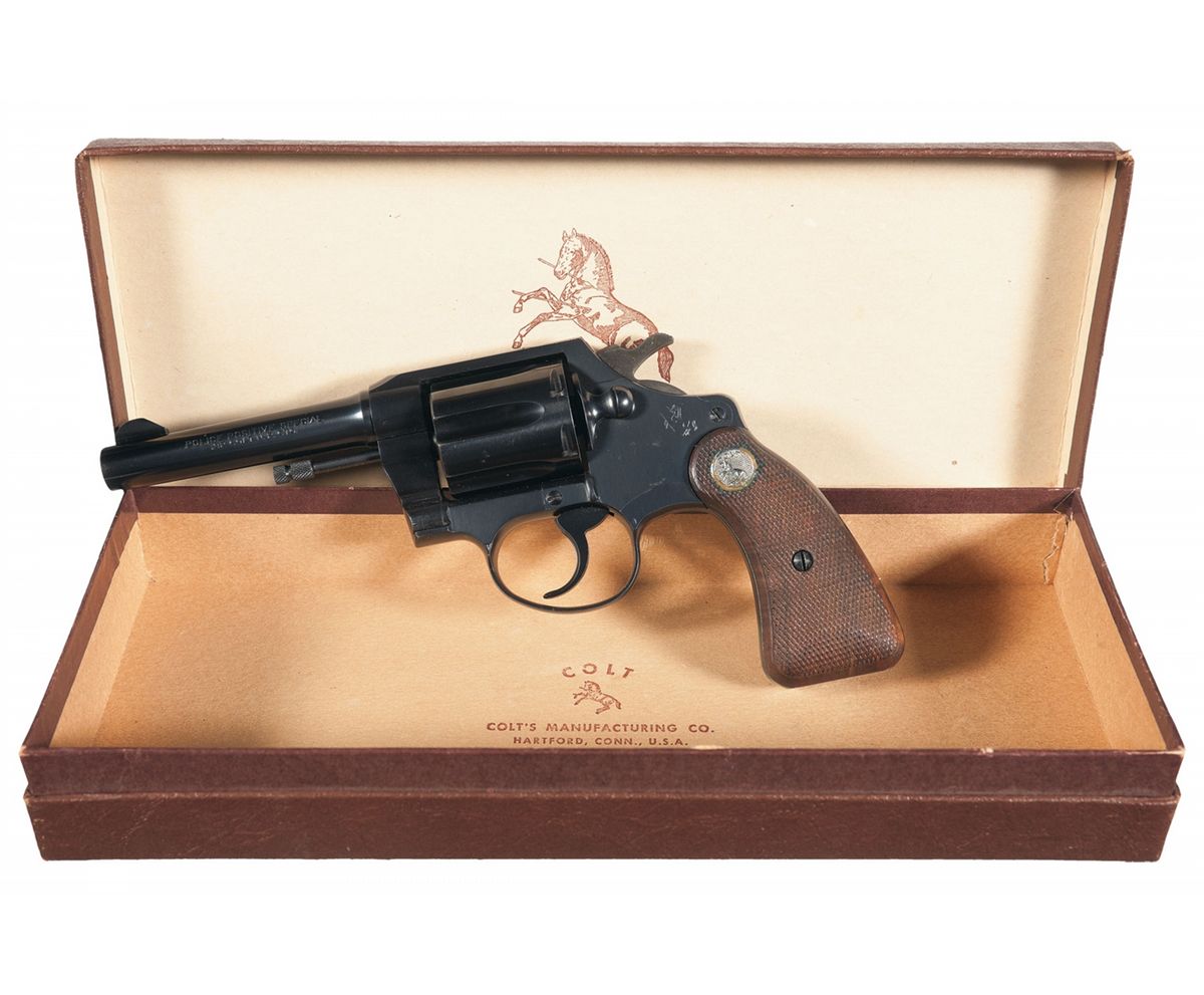 Manufactured in 1962. This revolver has a serrated trigger, serrated hammer, blade front sight, frame notch rear sight and fitted with checkered walnut grips with Colt medallions. With unnumbered brown hinged lid Colt box for a different model of gun.