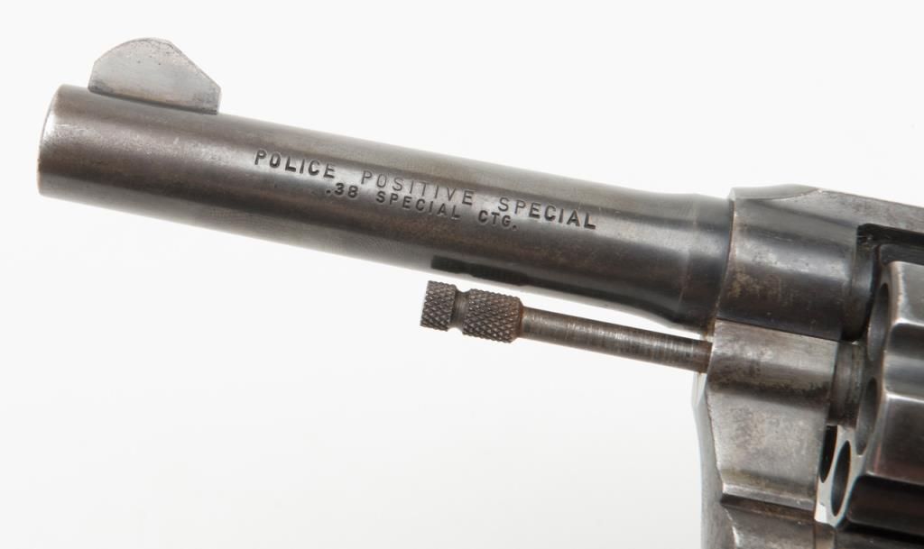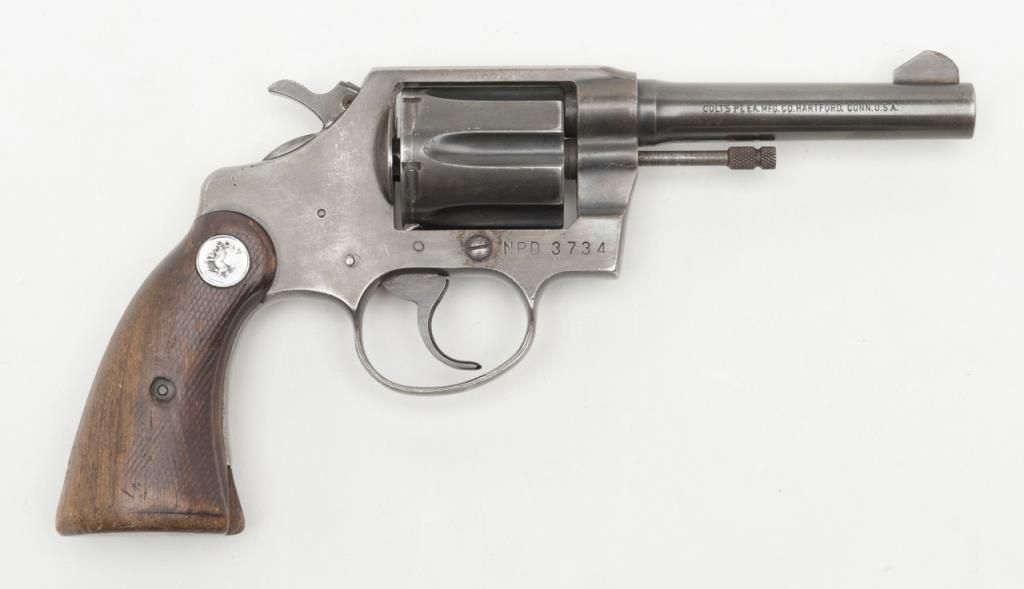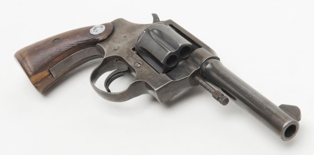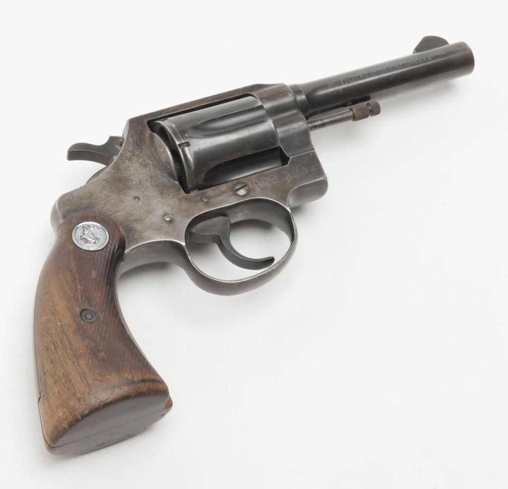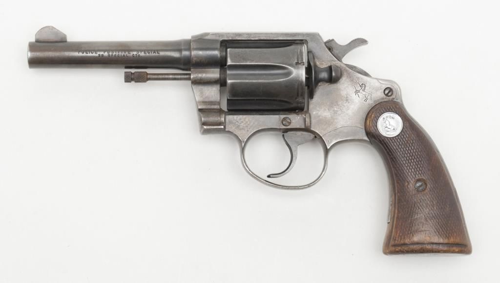Colt Police Positive Special revolver, .38 Special caliber, Serial #915985. The pistol is in overall good condition with a 4” blued barrel. The barrel retains a significant amount of its muted blued finish with holster wear at themuzzle. The action shows the majority of its blued finish with loss of finish at the rear of the action. The frame is marked “NPD 3734”, which is purported to indicate issue to the NYPD. The checkered medallion grips are in fair conditionshowing significant wear, with flattening of the checkering, mars and a loss of wood at the toe of the grip. The bore is good, the action crisp and markings sharp on this pistol. (C+R). Est.: $300-$600.
