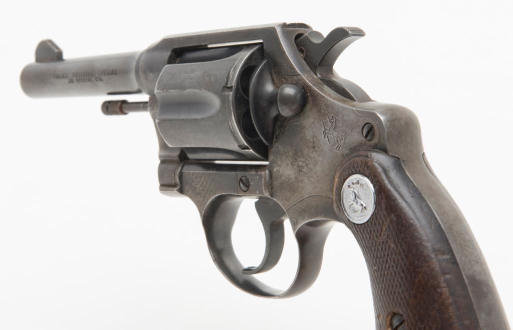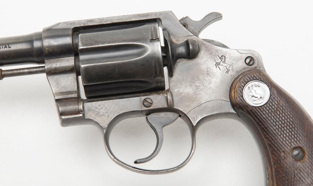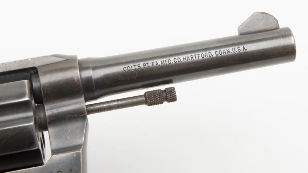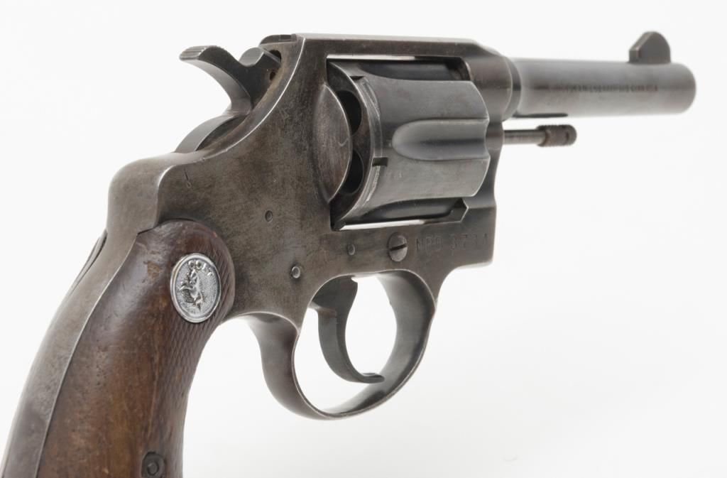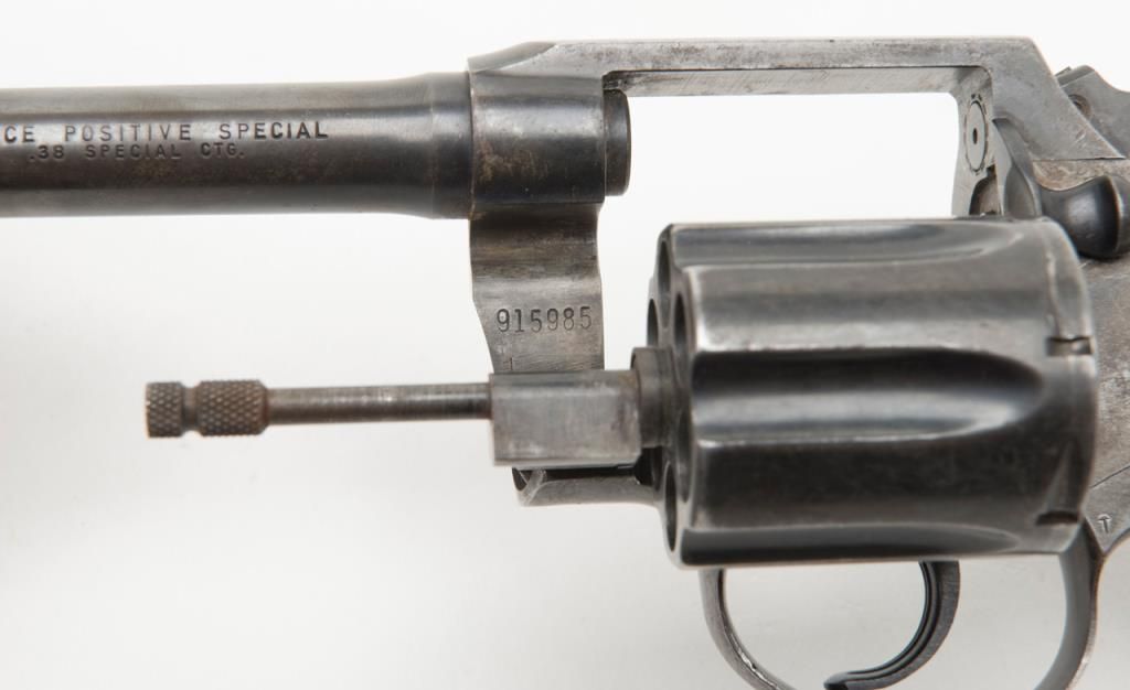 Colt Police Positive Special revolver, .38 Special caliber, Serial #915985. The pistol is in overall good condition with a 4” blued barrel. The barrel retains a significant amount of its muted blued finish with holster wear at themuzzle. The action shows the majority of its blued finish with loss of finish at the rear of the action. The frame is marked “NPD 3734”, which is purported to indicate issue to the NYPD. The checkered medallion grips are in fair conditionshowing significant wear, with flattening of the checkering, mars and a loss of wood at the toe of the grip. The bore is good, the action crisp and markings sharp on this pistol. (C+R). Est.: $300-$600.