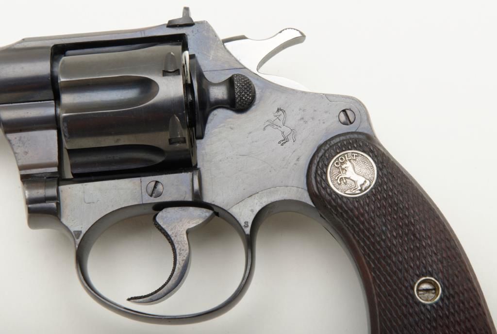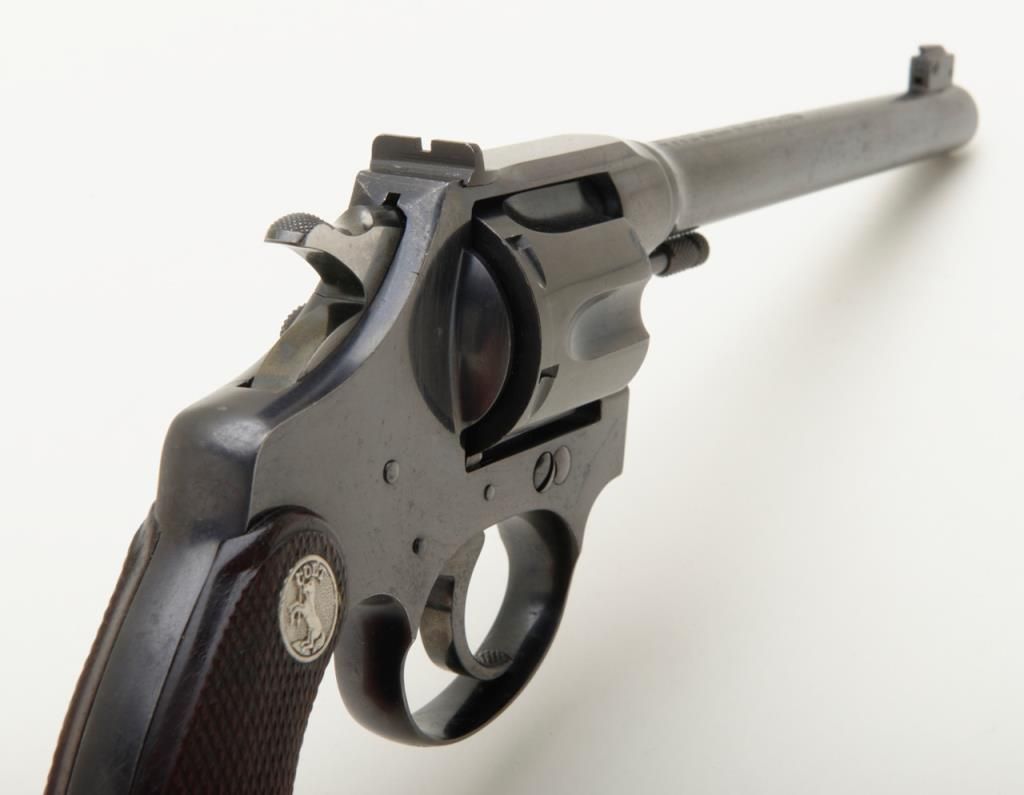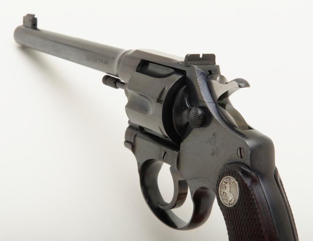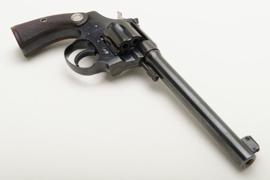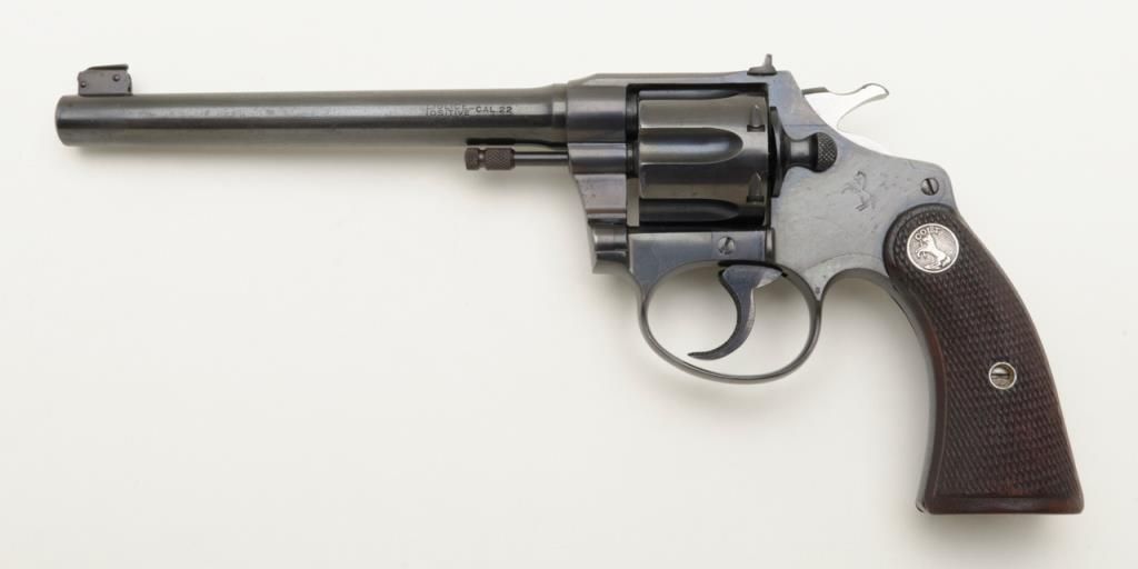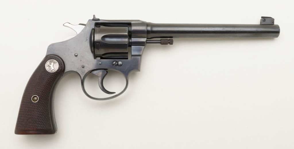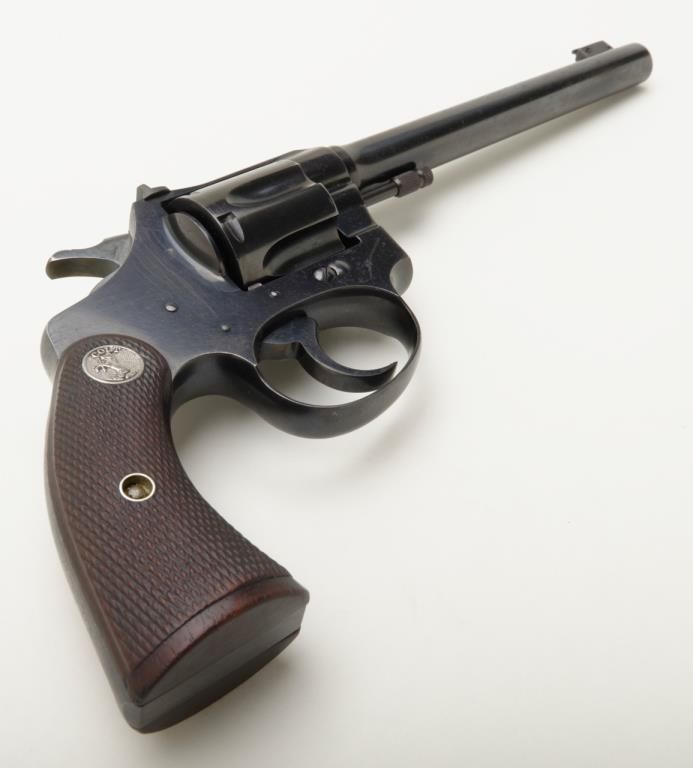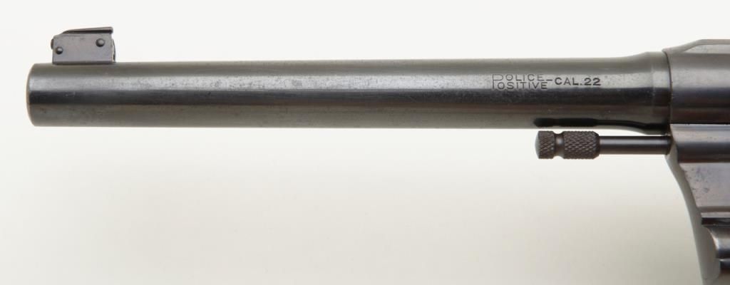 Colt Police Positive Target Model DA revolver, .22 cal., 6” barrel, blue finish, checkered wood medallion grips, #30027 in overall fine condition showing the majority of its original finish with high point wear, very good to near fine bore, crisp action, sharp markings and near fine grips. (C&R/PPT). Est.: $500-$1,000.