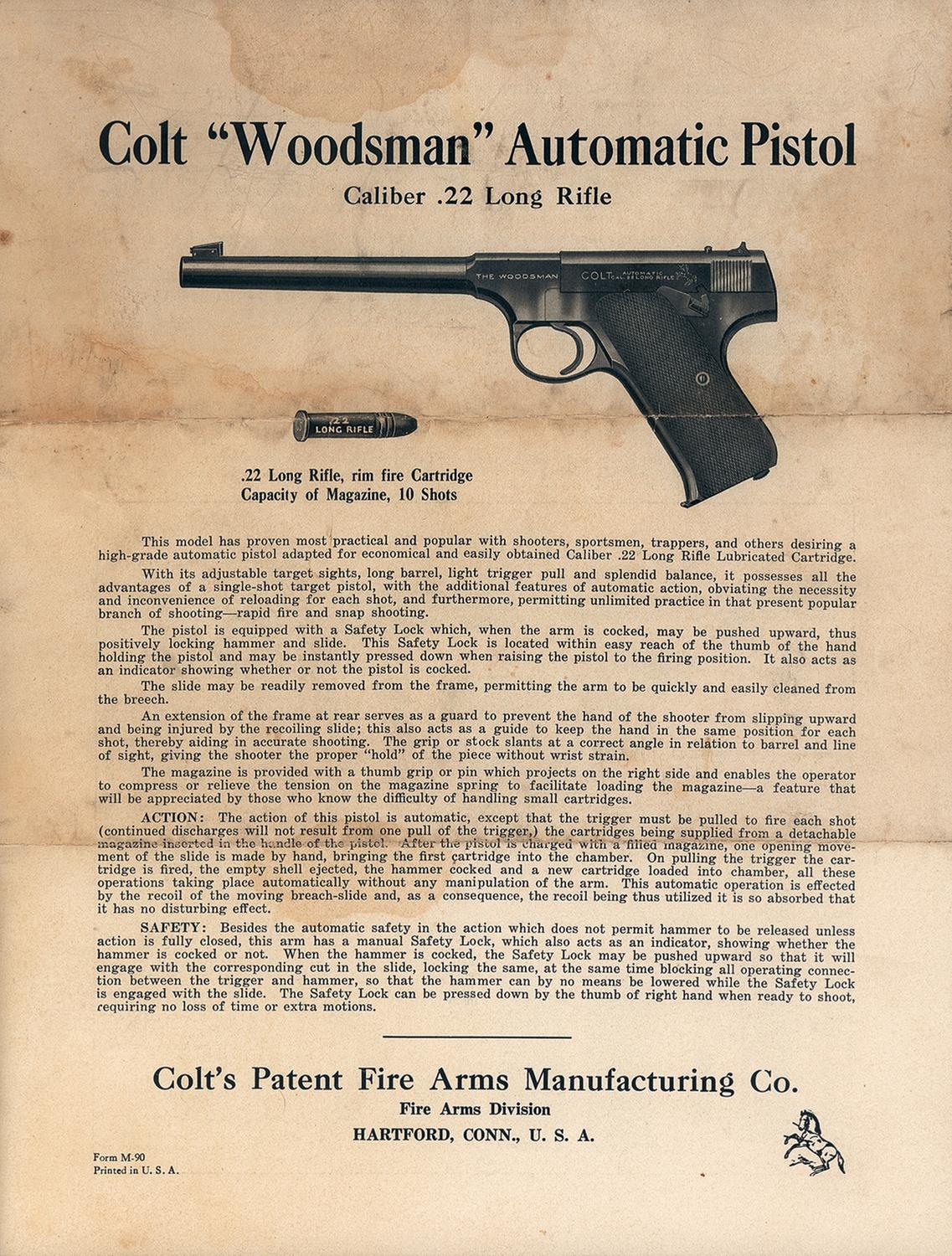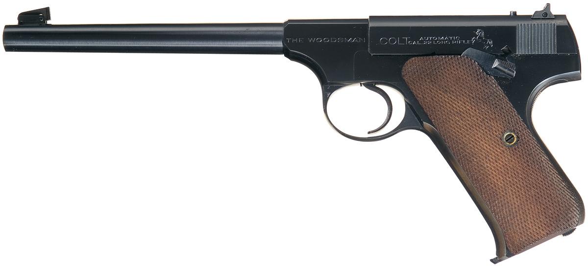 Manufactured in 1937. Fixed front and adjustable rear sights. Stamped with the two line Hartford address/patent dates (1903-1918) marking on the barrel with "THE WOODSMAN" on the left side of the chamber. The left side of the slide has the caliber marking along with the Rampant Colt. Fitted with checkered grips and a magazine marked "COLT WOODSMAN / CAL .22 L.R." on the bottom. With manual. The backstrap has the serrated panel indicating it's designed for high velocity ammunition.