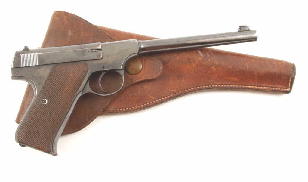 Colt Pre-Woodsman Cal .22 SN:37070 This early pre-woodsman marked semi-auto is calibrated for low speed ammo. The pistol retains approx 75-85% thinning blue, very good grips, good markings, good interior with bright bore, an early example which is collecThis early pre-woodsman marked semi-auto is calibrated for low speed ammo. The pistol retains approx 75-85% thinning blue, very good grips, good markings, good interior with bright bore, an early example which is collectible. Includes early flap holster which shows "H Chase, 2010 Water St, Olympia, WA". Includes 1 Colt 2-toned clip.