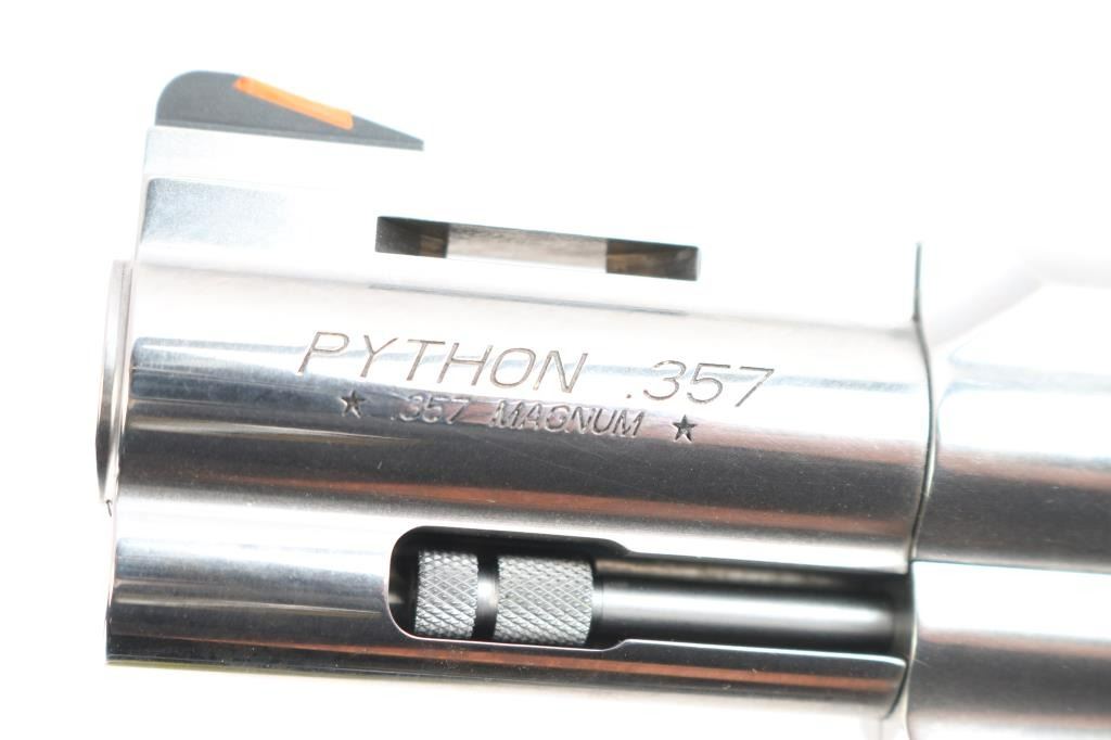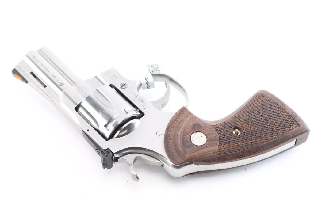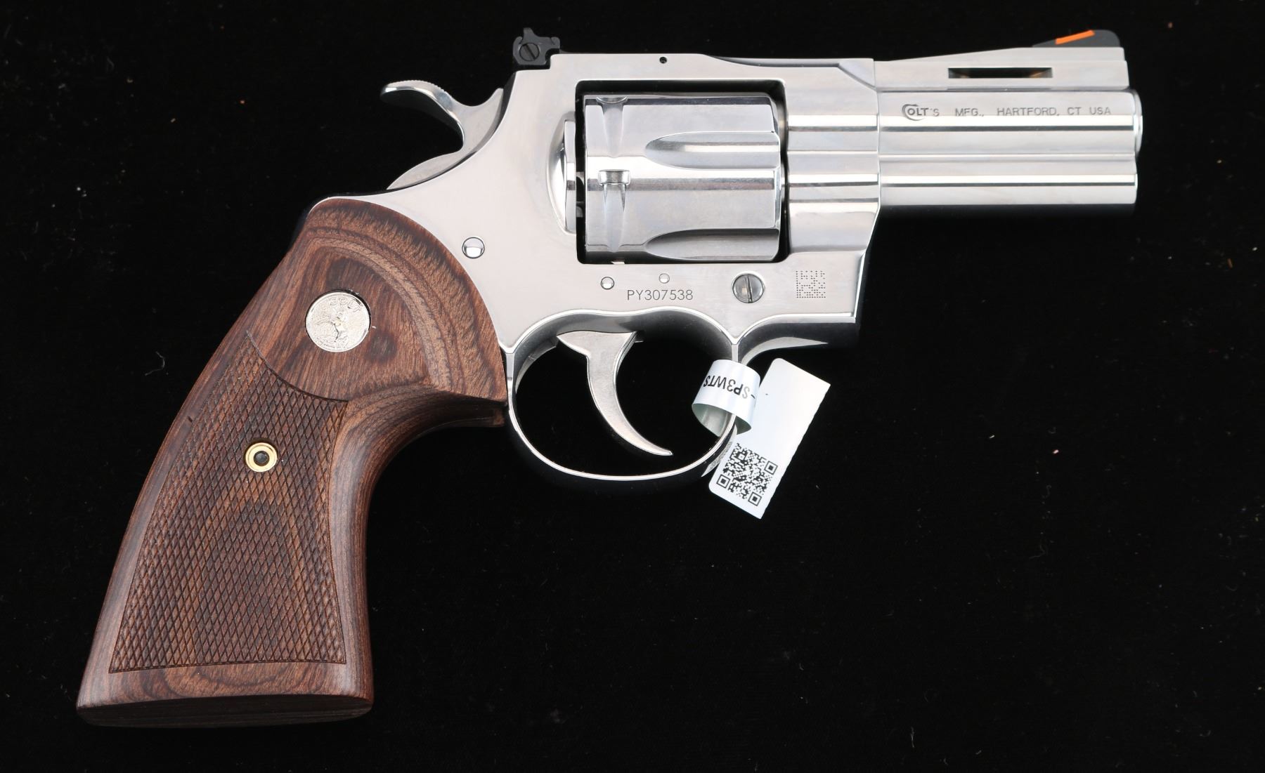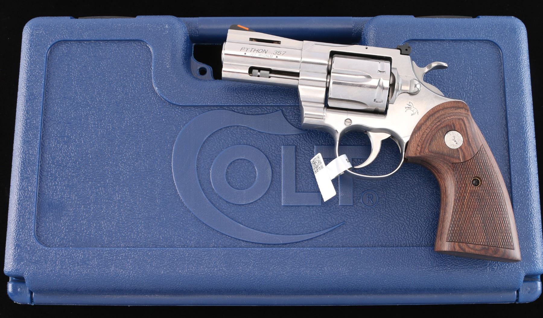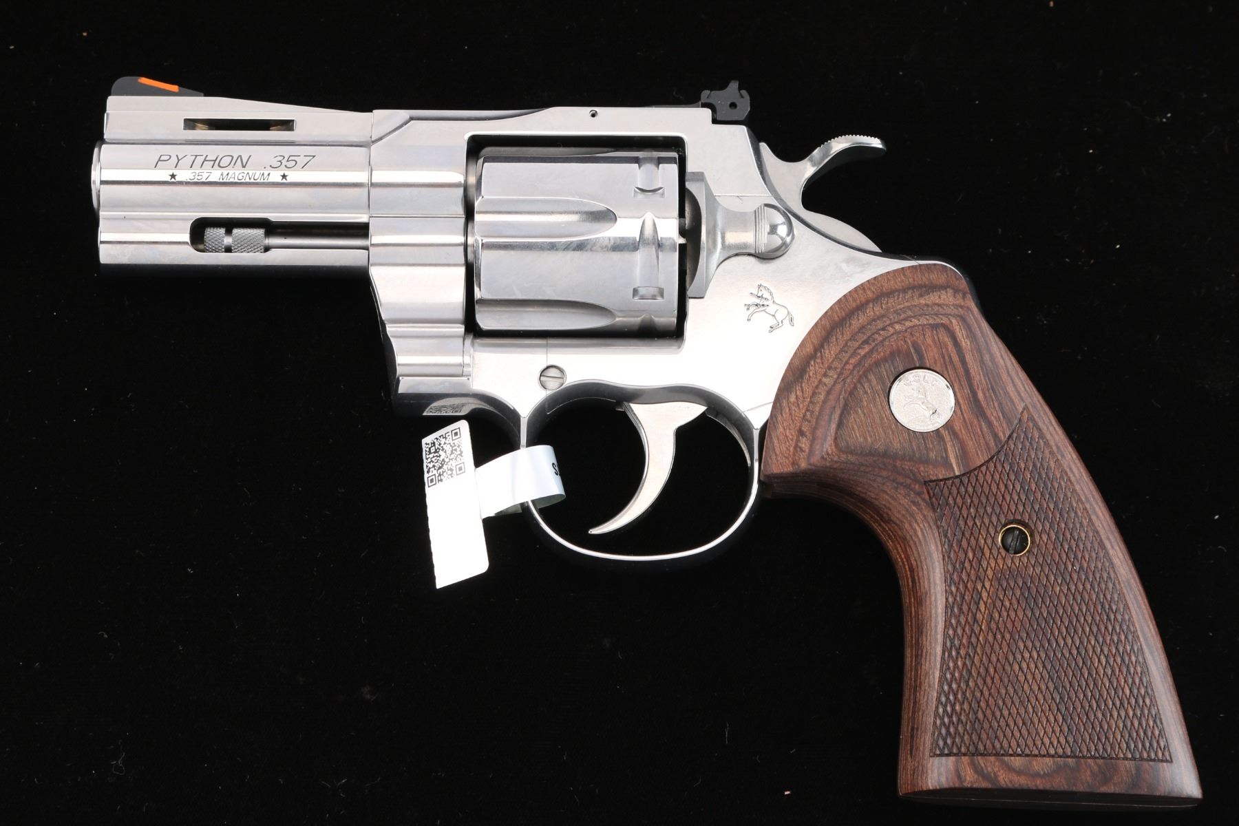 Premium American made medium frame double-action revolver chambered for .357 Magnum, manufactured after 2020 in Hartford, CT. The updated Python has been fully redesigned using more material on the top strap of the frame, a new rear sight, and an improved action with fewer internal parts. Revolver features a stainless steel construction with a polished finish, 3" vent ribbed barrel with recessed crown, full underlug, serrated ramped front sight with orange insert, micrometer adjustable square notched rear sight, fluted six-round cylinder, serrated cylinder release, knurled ejector rod head, serrated curved trigger, external hammer, serrated wide hammer spur, transfer bar safety, flat-top I frame, smooth backstrap, and checkered brown hardwood grips with silver Colt medallions. The original polished finish retained is approximately 99% with nothing remarkable. Metal displays no rust or deformation. Action is smooth and crisp with a tight lock-up. The bore is bright with strong rifling, and the cylinder chambers are also excellent. The wood grips are in excellent condition. Revolver includes the original blue foam-lined factory hard case with end label, documents, and lock.