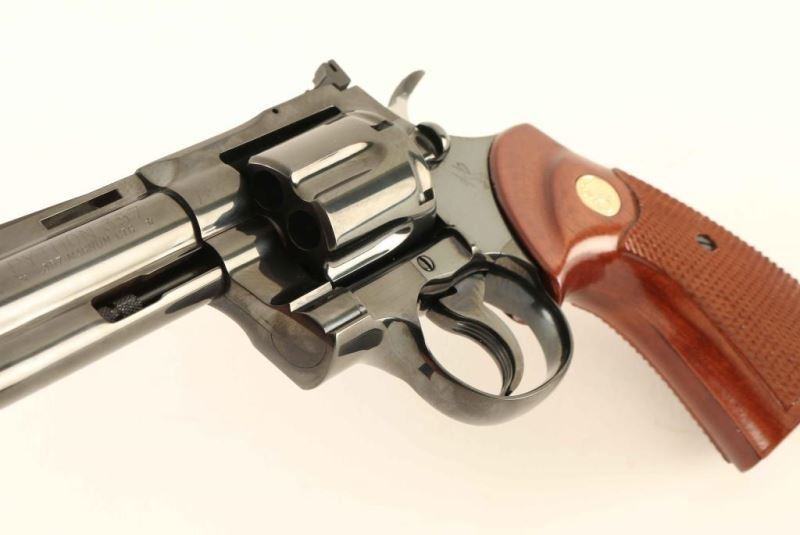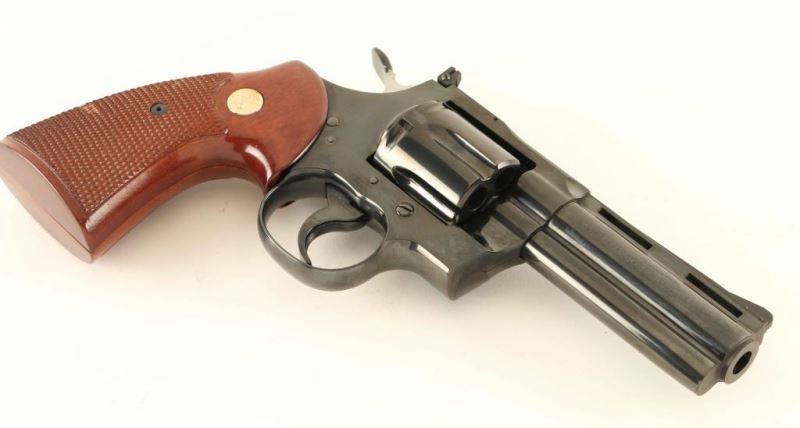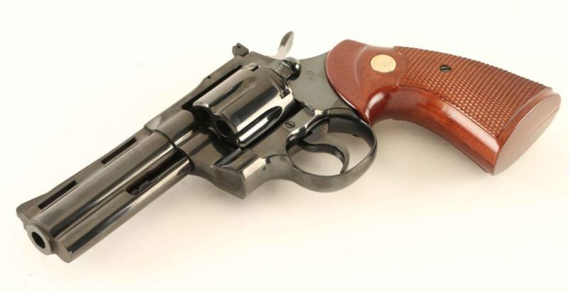 Early & desirable high quality medium frame double action revolver chambered in .357 Magnum, manufactured circa 1963. Features a Royal Blue finish, 4" vent rib barrel with full underlug, serrated ramp front sight, adjustable rear sight, fluted six-shot cylinder, serrated trigger, knurled wide hammer spur, serrated backstrap and two-piece checkered walnut target grips with gold Colt medallions. Revolver exhibits approximately 96% of it's original blued finish showing some dulling and oxidation on the right side. Action is very smooth with solid lock-up, the bore is pristine, and wood grips have a scratch on the right panel but are otherwise fine. Condition is NRA Very Good+++. ***C&R Firearm***