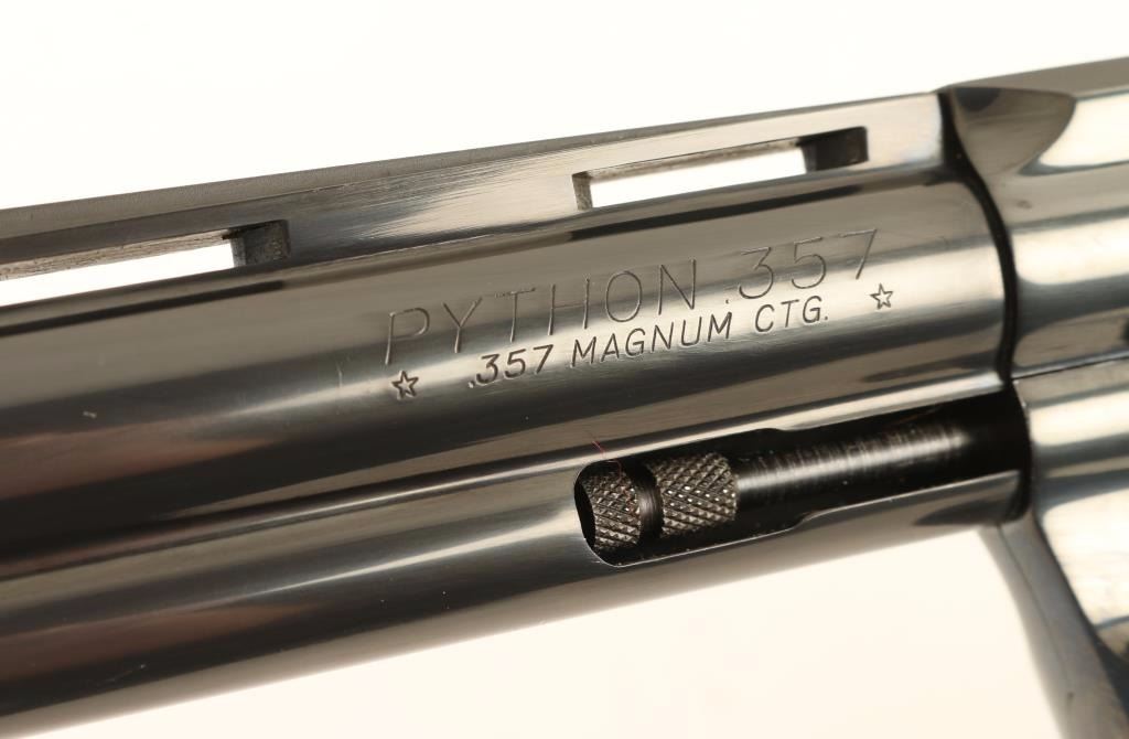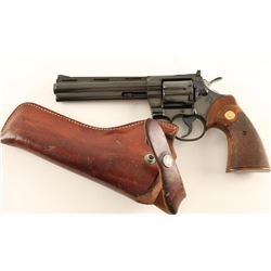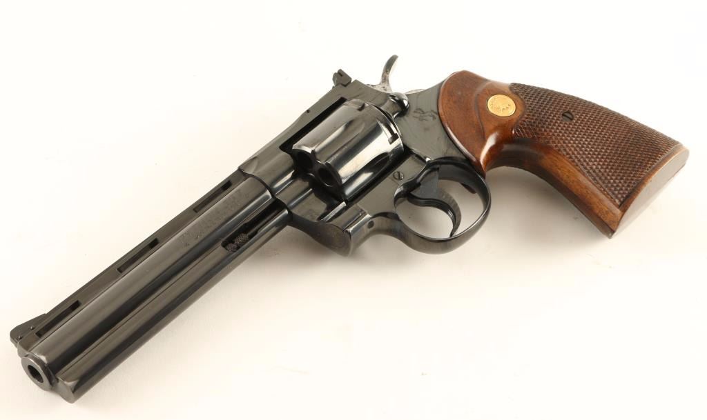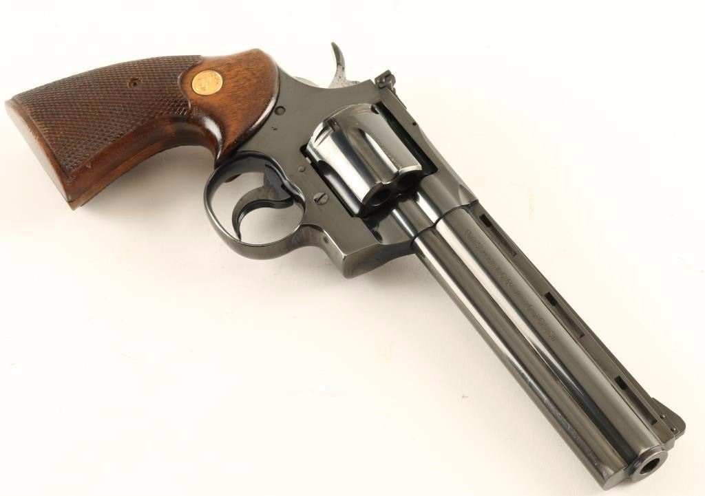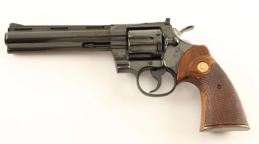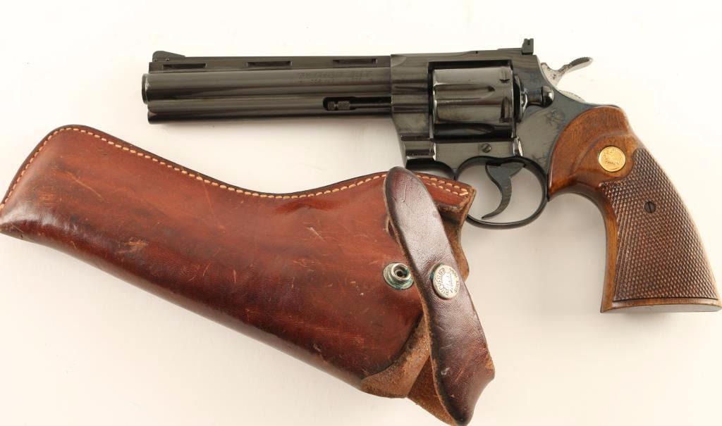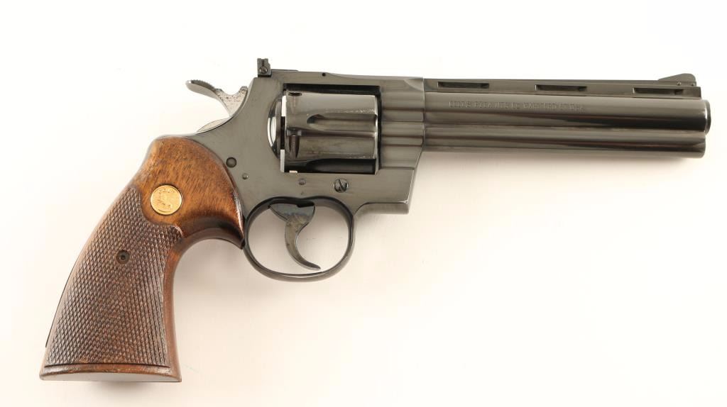 Desirable double-action revolver chambered in .357 Magnum, circa 1963. Features a blued finish, 6" vent rib barrel with full underlug, patridge front sight, adjustable rear window sight, fluted six-shot cylinder, serrated trigger, checkered wide hammer spur, serrated backstrap, and two-piece Colt medallion checkered walnut grips. Includes a smooth brown leather Bucheimer belt loop holster. Revolver retains 92% of it's original blued finish showing holster wear, and some light surface rust forming in the serrations on the backstrap. Action is very smooth, bore is pristine, and wood grips are very good. Condition is very good++. ***C&R Firearm*** ***Modern Firearm***