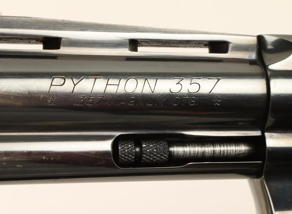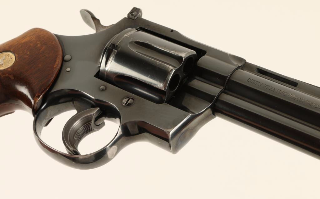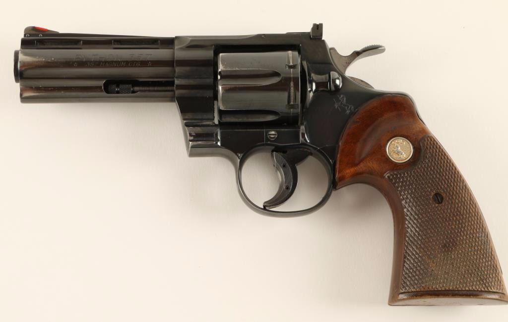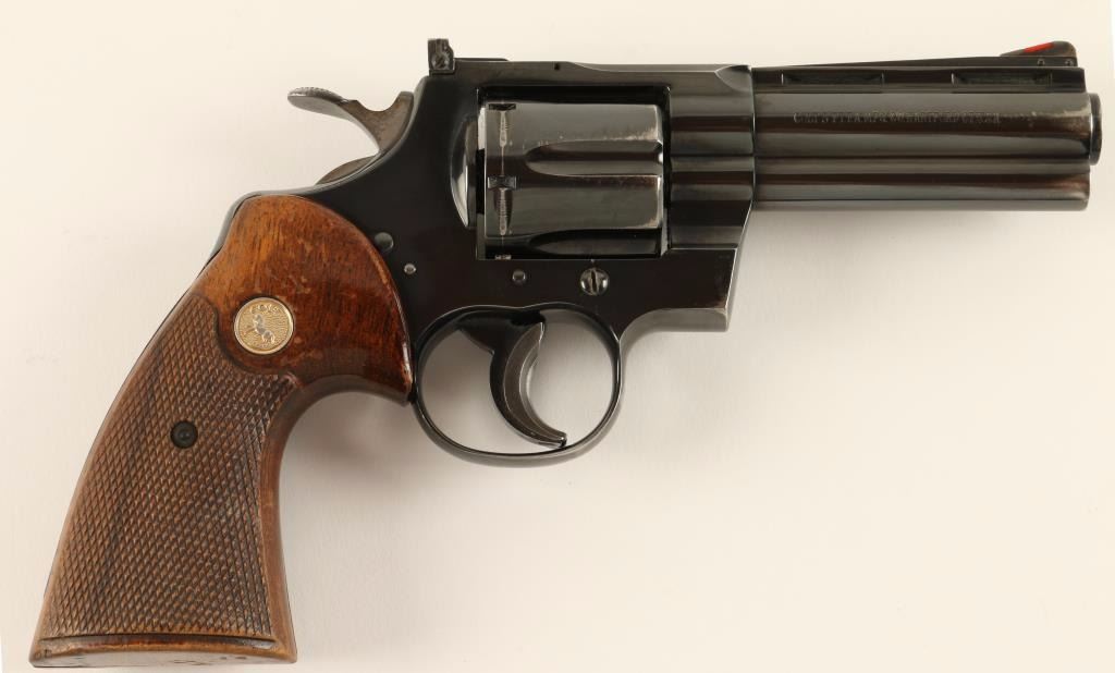Premium double action revolver chambered in .357 Magnum, circa 1964. Features a Royal Blue finish, vent ribbed 4" barrel with full underlug, front ramp sight with red insert, adjustable rear window sight, serrated trigger with shoe, checkered hammer spur, fluted six-shot cylinder, serrated backstrap, and Colt medallion checkered walnut grips. Revolver retains 85% original finish with holster wear and light handling marks. Action is smooth, bore is excellent, and wood grips are good with moderate wear. Condition is very good++. ***C&R Firearm*** ***Modern Firearm***