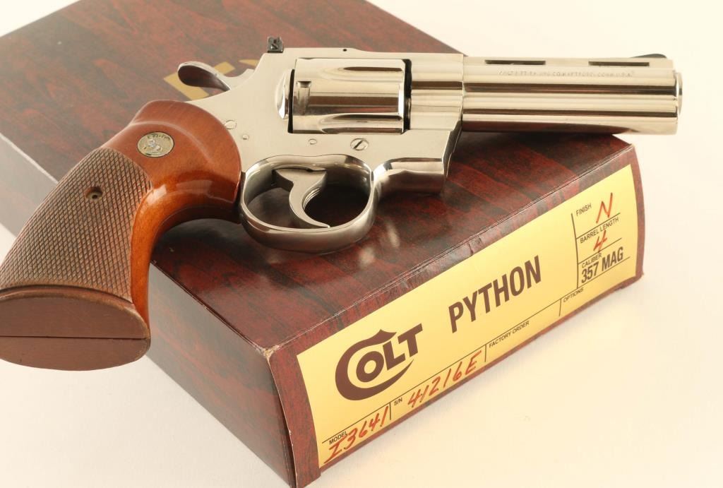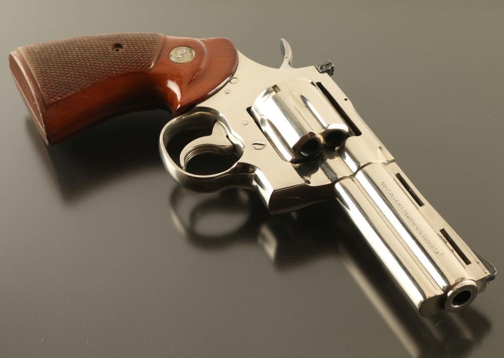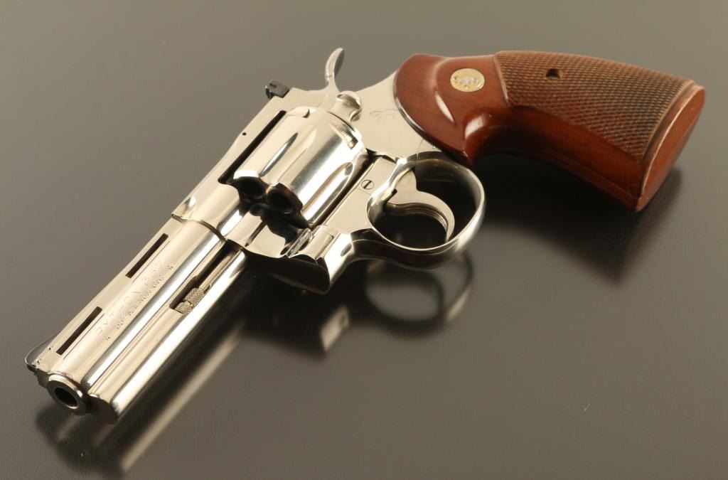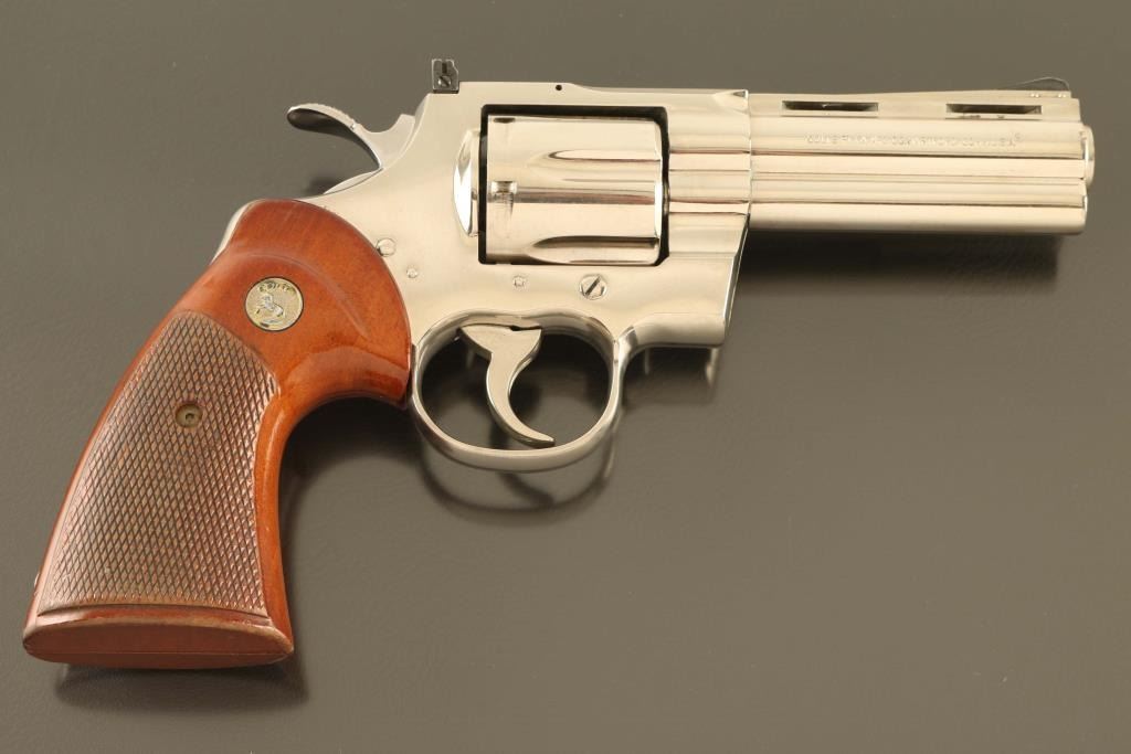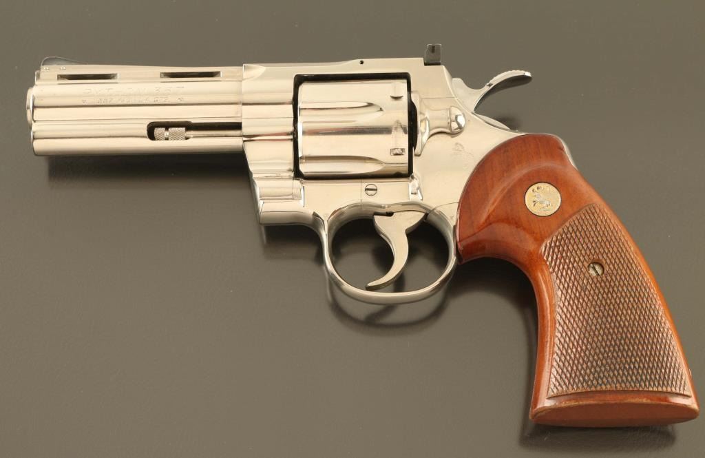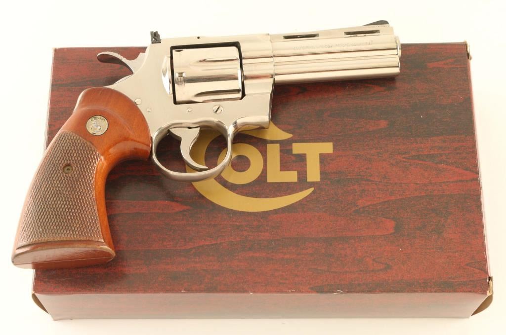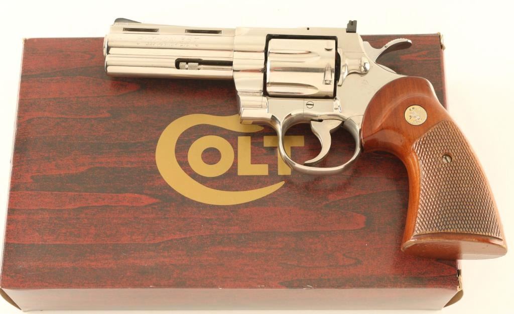 Desirable large frame double action revolver chambered in .357 Magnum, manufactured in Hartford, CT circa 1976. Features a bright nickel plated finish, 4" vent rib barrel with full underlug, serrated ramp front sight, fully-adjustable rear sight, serrated trigger, knurled wide hammer spur, fluted six-shot cylinder, ‘I’ frame with serrated backstrap and checkered walnut target grips with gold Colt medallions. Includes a reproduction wood grain cardboard box with styrofoam and documents. Revolver retains approximately 97% of its original nickel plated finish showing superficial scratches, some small dings on the barrel towards the muzzle and losses on the right side of the barrel rib. Action is very smooth with solid lock-up, the bore is excellent, and the refinished wood grips are good with wear. Condition is NRA Very Good+ in box. ***Modern Firearm***