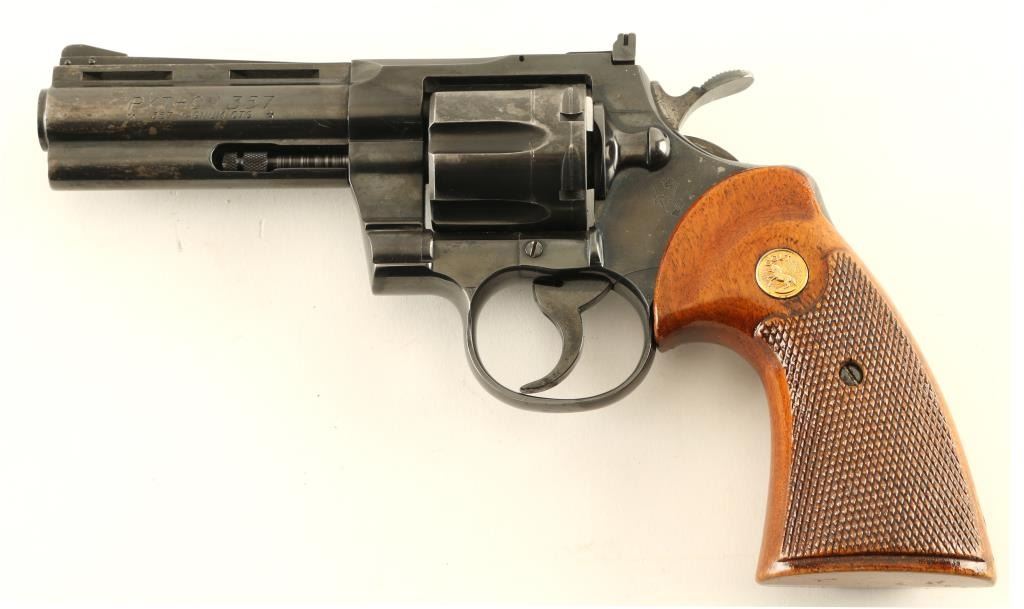 Blued steel revolver chambered for 357 Magnum. Features grooved trigger, checkered hammer, 4 inch vent rib barrel, adjustable sights, checkered wood grips with colt medallions. Bore and charge holes in cylinder are excellent. Blued finish has turned gray at sides of barrel and lug near muzzle; appears due to previous light rust being removed. Cylinder has a similar grayish color over much of its surface, tending to dull black in flutes. Pinprick spots of gray or bare metal in various places, particularly left side of frame. Backstrap has largely turned gray from handling. Grips are very good with very small area of wrinkling to varnish on right panel. Condition is NRA Good ***Modern Firearm***