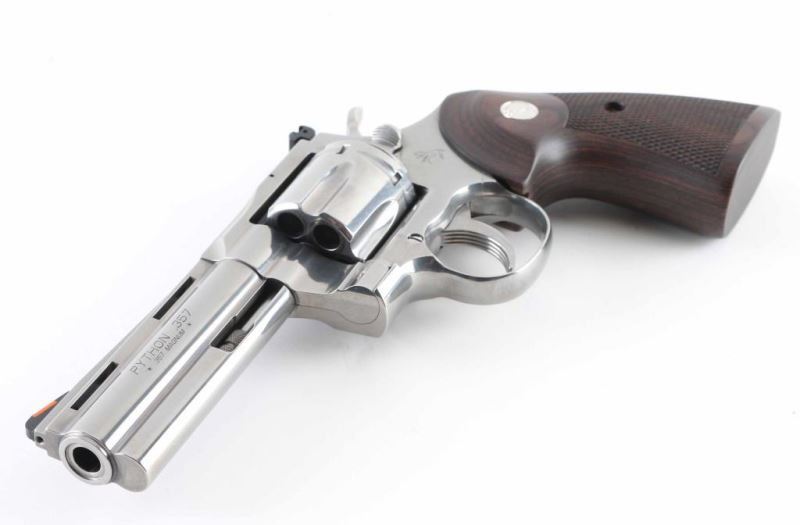 Double action revolver features stainless steel construction, laminated wood grips with checkered panels & silver color Colt medallions, 4" vent rib barrel with full length underlug, adjustable sights, grooved narrow trigger, checkered wide spur hammer. Bore is excellent. Overall condition is near new with few signs of handling or use. Action is smooth with tight lock-up. Includes Colt blue hard plastic case.