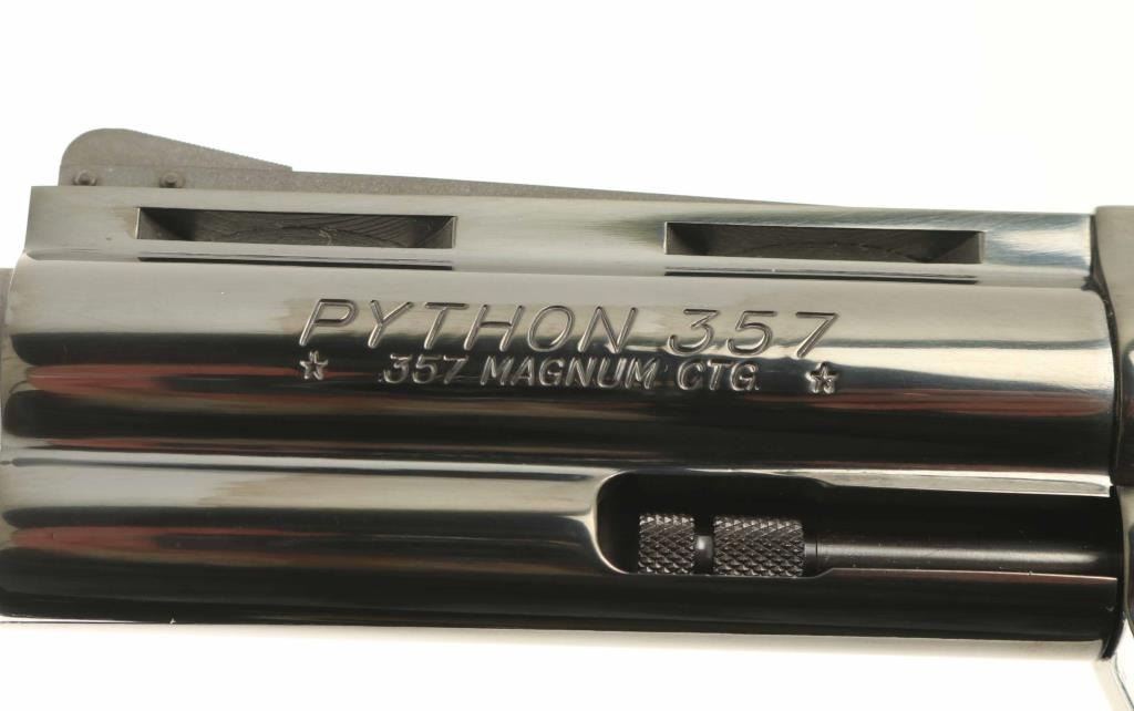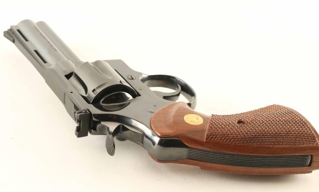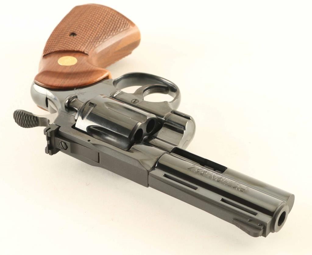 Double action revolver manufactured circa 1979. Features blued finish, checkered wood target type grips with gold color Colt medallions, 4" vent rib barrel with full length underlug, adjustable sights, grooved narrow trigger, checkered wide spur hammer. Bore is excellent. Retains 98% blue, with light drag line on cylinder, few signs of handling. Grips are excellent. Action is smooth, locks up tight. Condition is NRA Excellent *** Modern Firearm ***