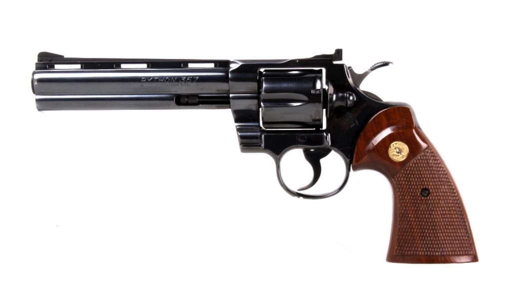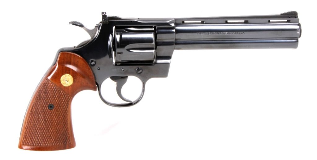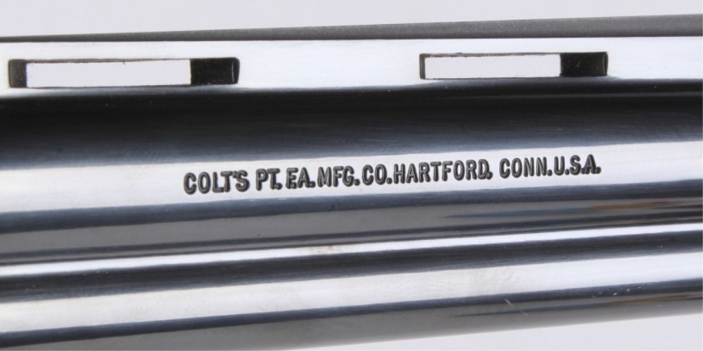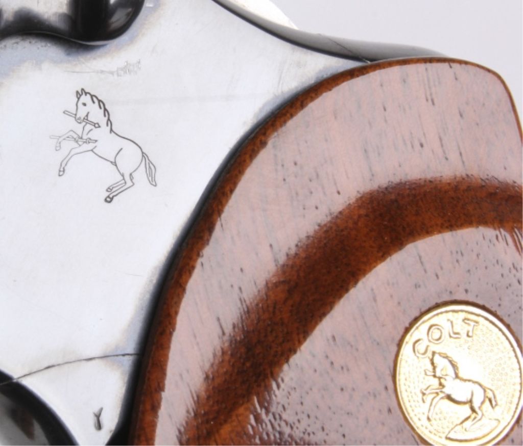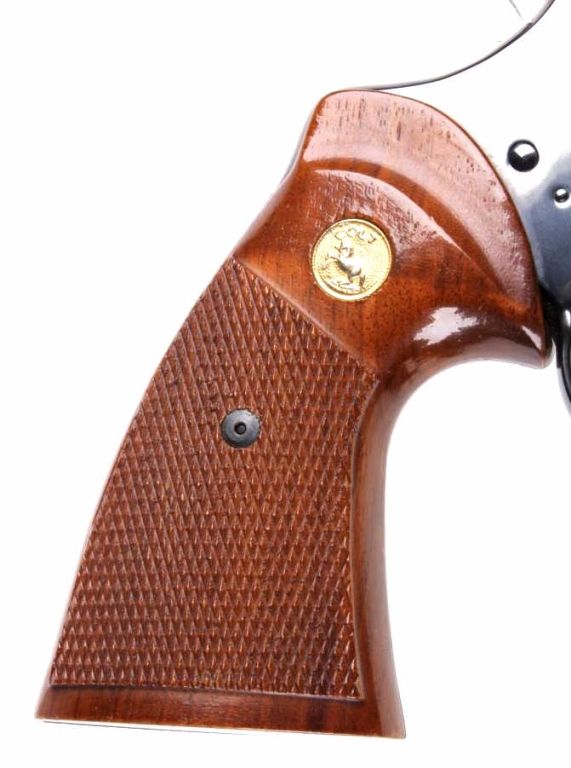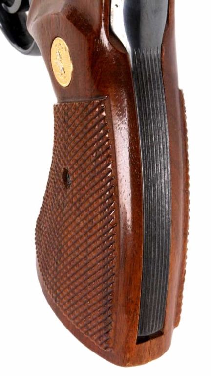 This is a rare gun that is in mint condition showing beautiful bluing and the wood grips with perfect checkering. Features a vented ribbed barrel, 6" barrel, target sights, and gold Colt tags on each grip. The only wear