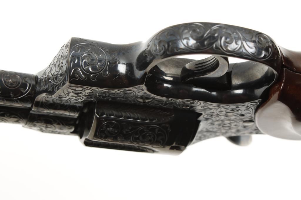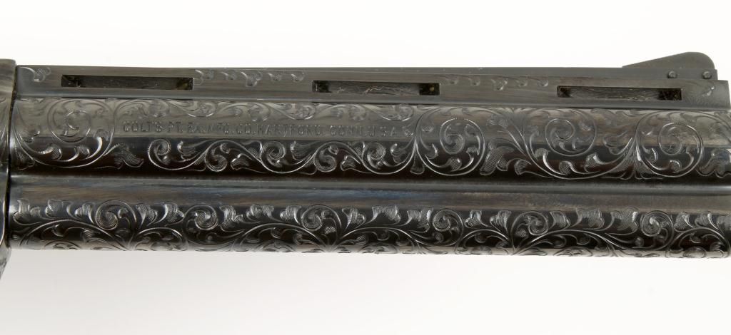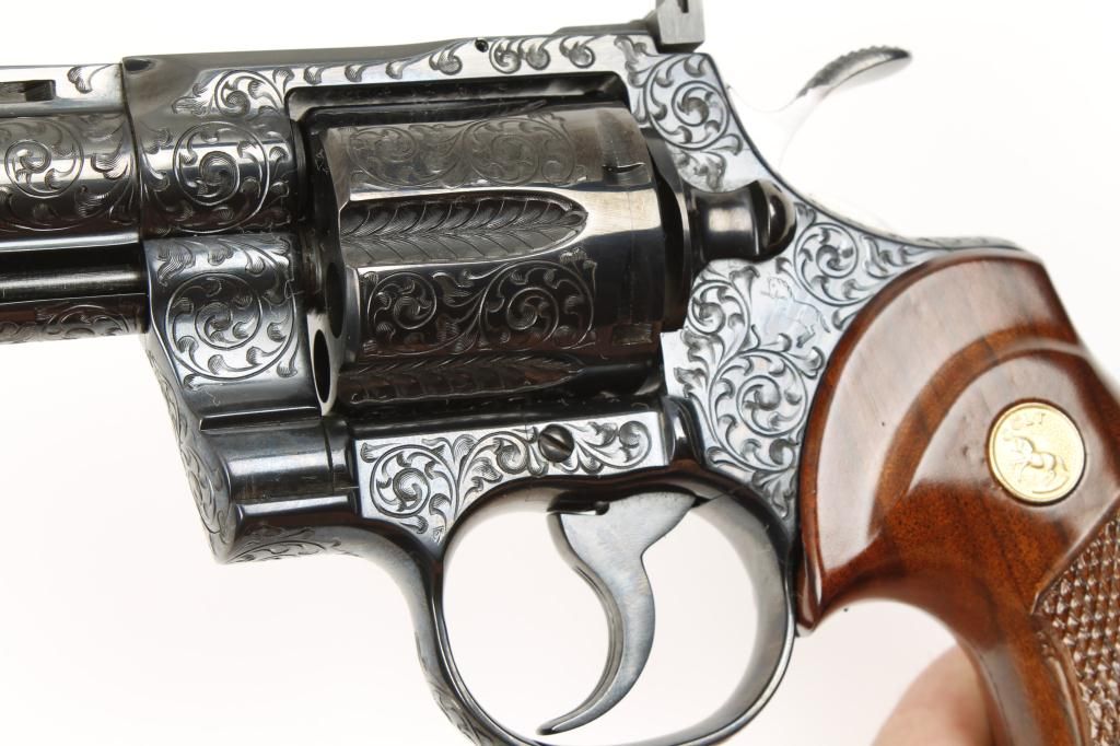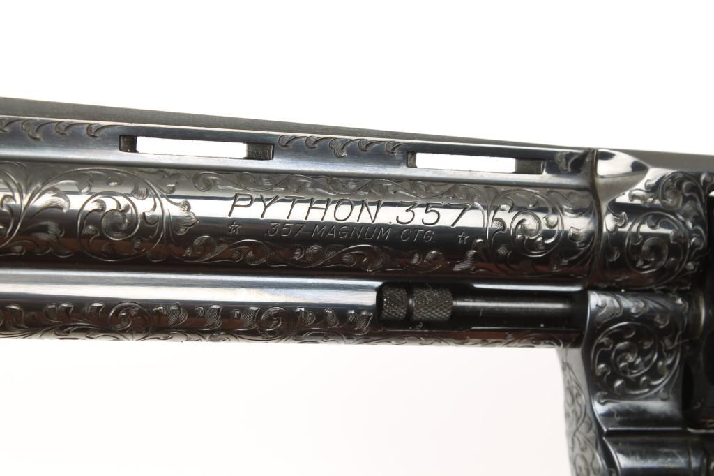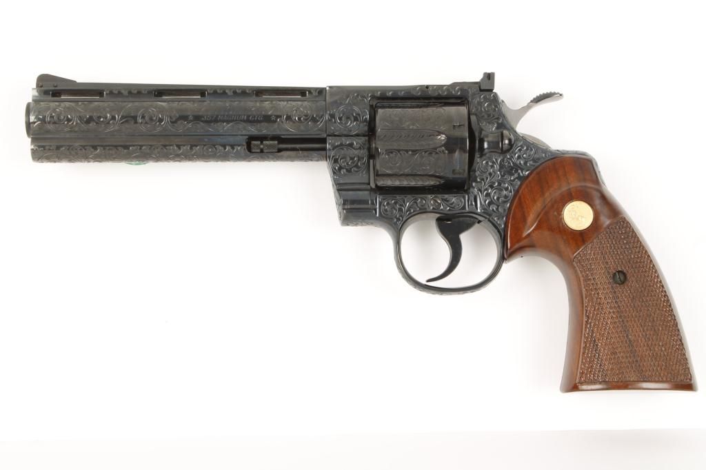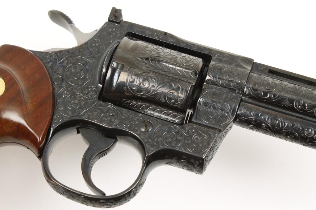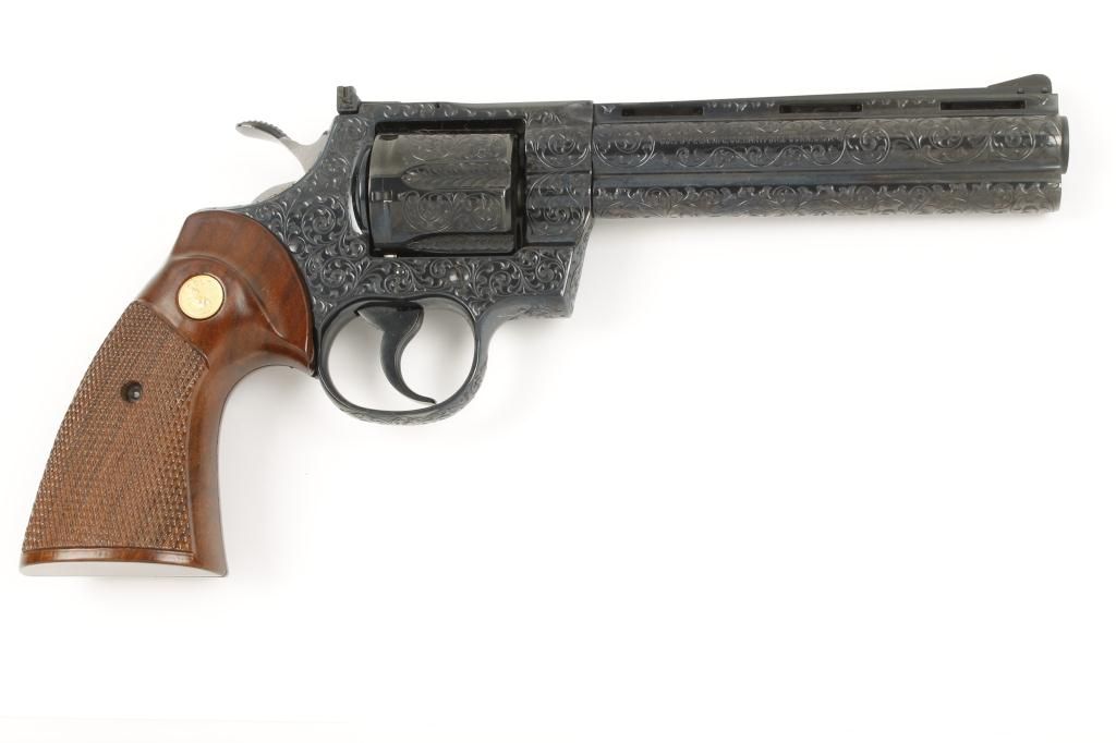 Colt Python .357 Magnum caliber, double action revolver, factory D grade engraved, blued finish, medallion checkered wood grips, serial number 49612E. This revolver remains in fine to excellent condition showing 98% to 99% original blue with possible test firing and minor use but near mint. The revolver is nicely engraved in an open vine scroll style that may be the hand of A. A. White engravers but definitely factory engraved. Est.:$1,500-$3,000.