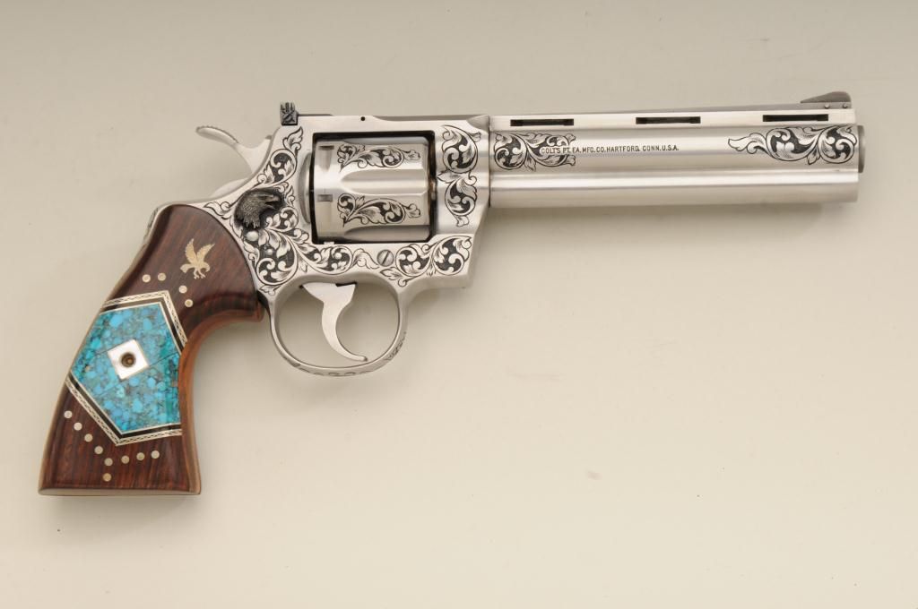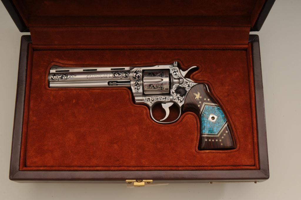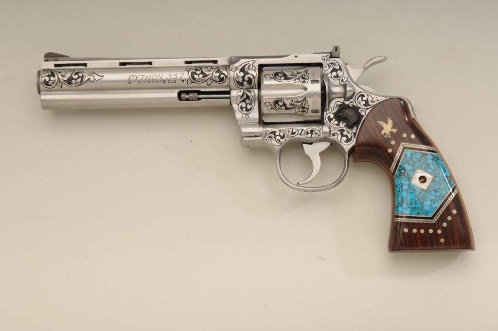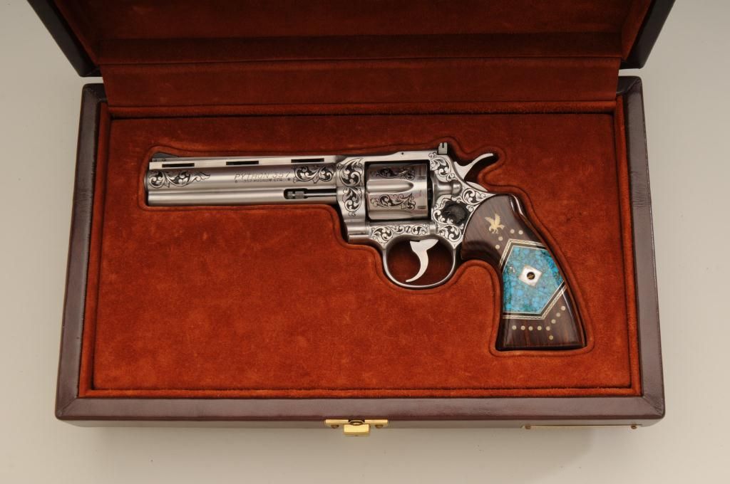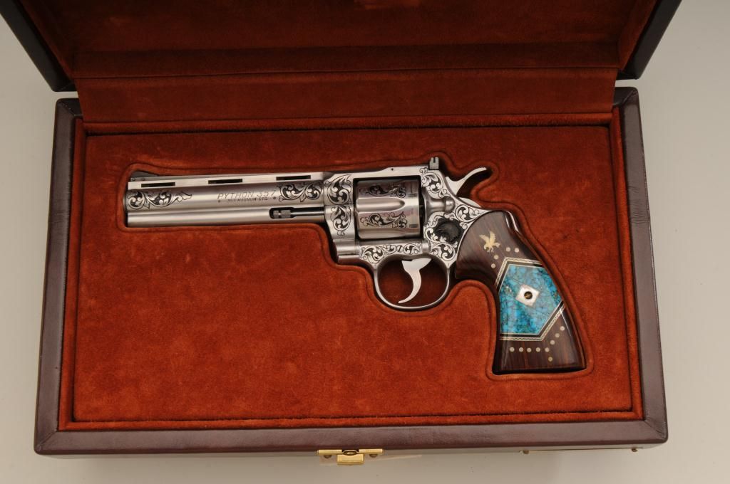 Colt Python .357 Magnum double action revolver stainless steel with 6” barrel, deep scroll engraved with Eagle head inlays on each side of frame and fancy custom made exotic laminated wood and silver inlaid grips with elaborate turquoise and silver inlays at center. The bottom of frame is signed Heune with a small stamp showing the south side of a stag headed north. The trigger guard is engraved with the initials G.H.J.The condition is fine to excellent showing some slight use. The action is tight and the bore is just slightly dirty and would clean. The grips are also fine to near excellent showing a great deal of quality workmanship.The revolver is contained in a extra fine custom French style fitted case with leather exterior. The exterior of the case shows a makers plaque which is engraved, “Case By Georgianna”. The case is fine to excellentand would be very expensive to replicate. Est.: $1,500-$3,000.