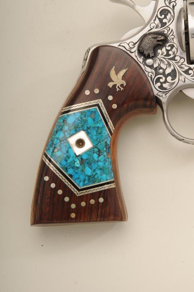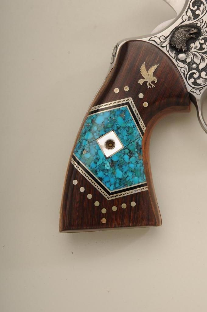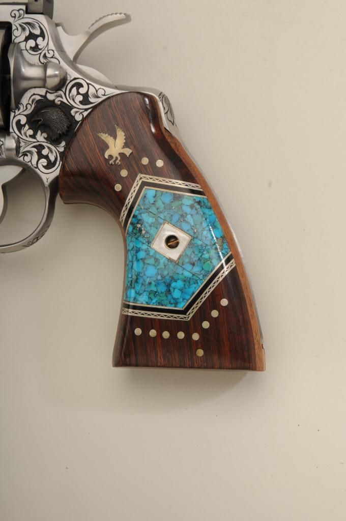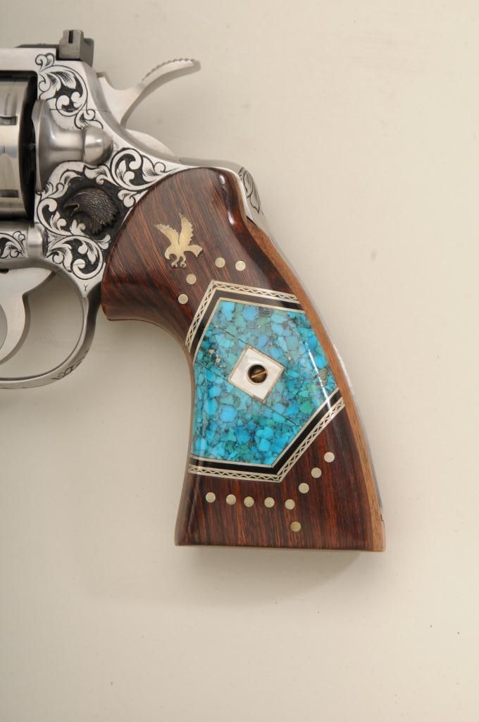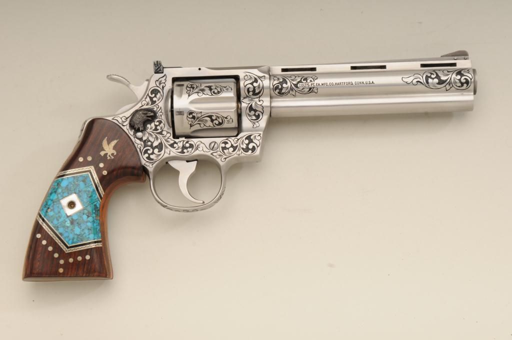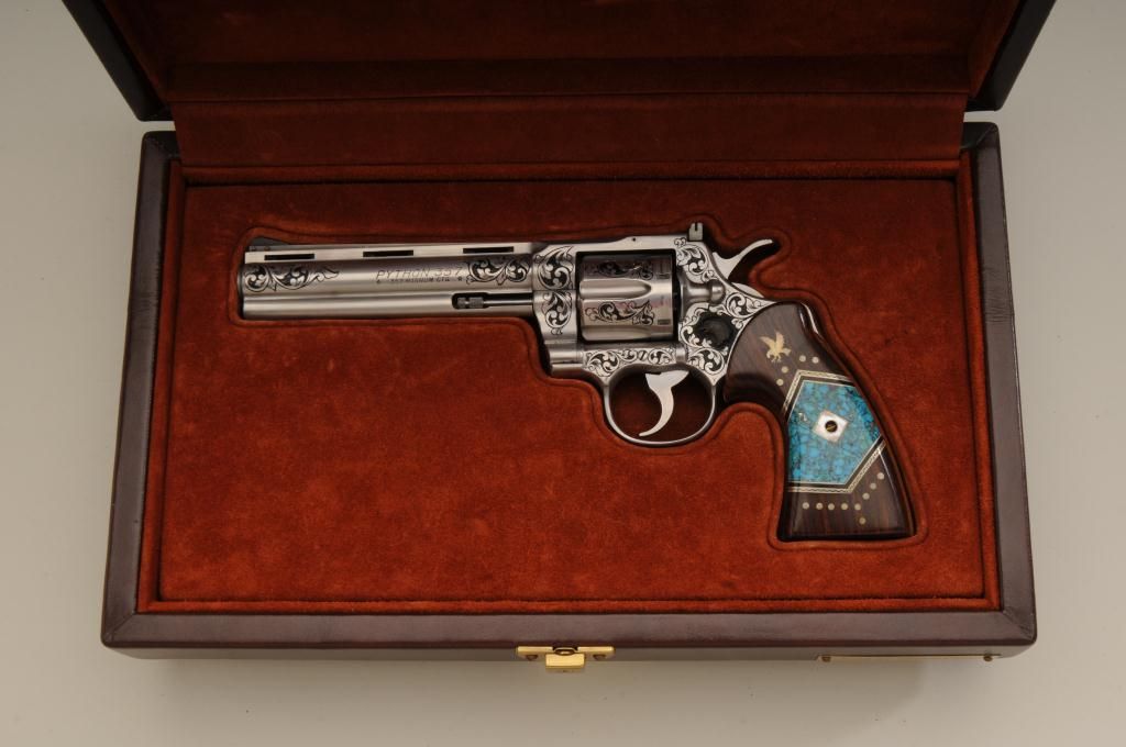 Colt Python .357 Magnum double action revolver stainless steel with 6” barrel, deep scroll engraved with Eagle head inlays on each side of frame and fancy custom made exotic laminated wood and silver inlaid grips with elaborate turquoise and silver inlays at center. The bottom of frame is signed Heune with a small stamp showing the south side of a stag headed north. The trigger guard is engraved with the initials G.H.J.The condition is fine to excellent showing some slight use. The action is tight and the bore is just slightly dirty and would clean. The grips are also fine to near excellent showing a great deal of quality workmanship.The revolver is contained in a extra fine custom French style fitted case with leather exterior. The exterior of the case shows a makers plaque which is engraved, “Case By Georgianna”. The case is fine to excellentand would be very expensive to replicate. Est.: $1,500-$3,000.