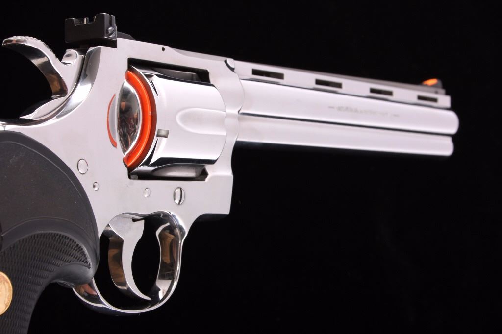 Available for sale is an exceptional Colt Python double action 357 Magnum revolver in a bright stainless steel finish with extremely rare 8 inch barrel. The revolver is in like new in the box condition showing 98%+ finish (has been fired). Marked on the left side, "PYTHON 357 MAGNUM CTG." along with the Rampant Colt trademark. Marked on the right side, "COLT’S PT.F.A. MFG. CO. HARTFORD, CONN.U.S.A." The revolver shows the original factory black rubber Presentation Pachmayr grips with a round brass Rampant Colt medallion on each side. The firearms comes with the original Colt hard plastic case, original serial numbers matching Colt cardboard box, and original octagon paper Colt warning tag. The revolver shows a Serial Number of KT9716 . This is the signature model of weapon used by character Rick Grimes in the TV show, The Walking Dead. Modern Firearms requires FFL Transfer or NICS Background Check. Model: I3084 Caliber: .357 Magnum Python Barrel Length: 8 Inch Finish: B STS (Bright Stainless Steel) Serial Number: KT9716