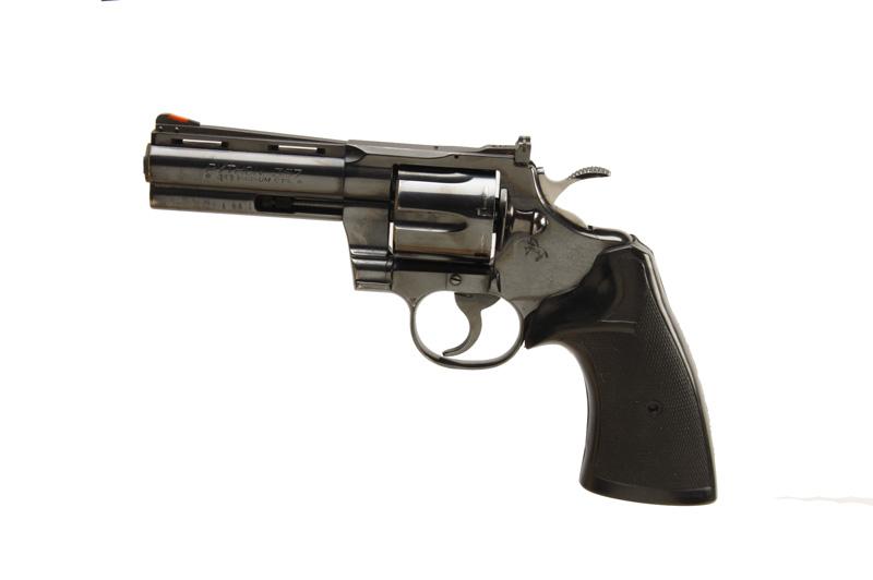 Colt Python Cal .357 Mag SN:89773F Double action 6 shot revolver with vented rib,. Blued finish, black after market stocks, 4" barrel, adjustable sights, good bore and action.