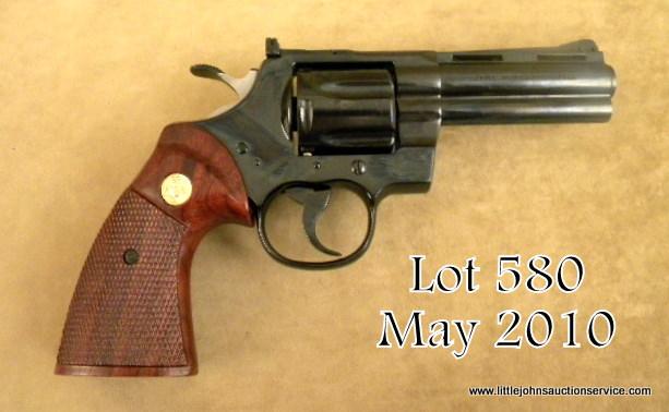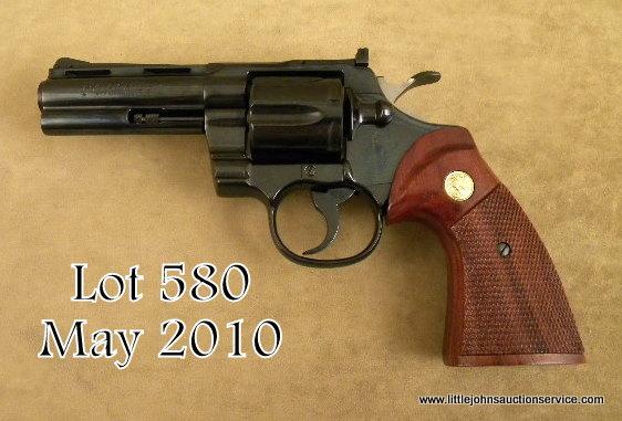 Colt Python DA revolver, .357 Magnum cal., 4” barrel, blue finish, checkered Colt gold medallion wood combat style grips, in original factory wood grained cardboard box, #K36685. This gun is in overall near new condition showing littlehandling, approx. 100% original finish, fine bore, action and grips; very collectible and particularly desirable in the 4” barrel variation. Est.: $900-$1,800.
