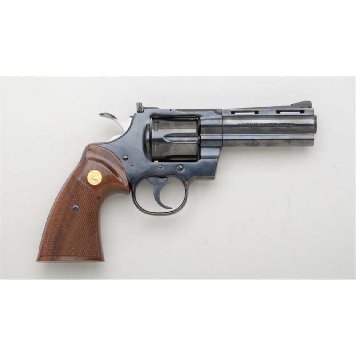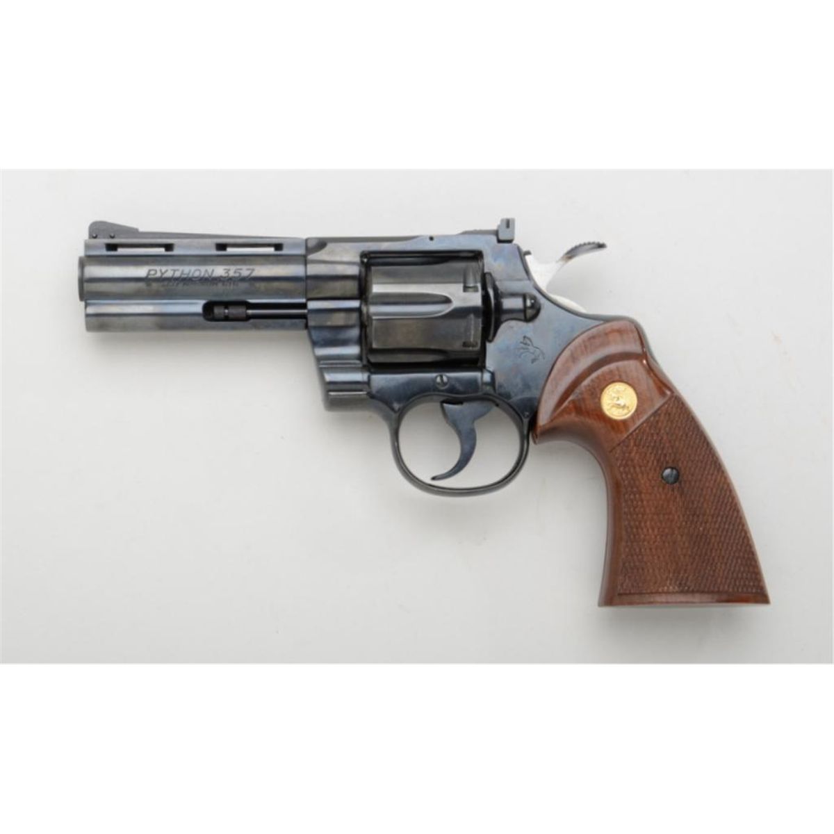 Colt Python DA revolver, .357 Magnum cal., 4” ventilated rib barrel, blue finish, checkered wood medallion combat grips, #K29975. This gun is in overall excellent condition showing the majority of itsoriginal blue finish, fine bore, action, markings and grips; always a desirable Colt collector’s piece. Est.: $700-$1,400.