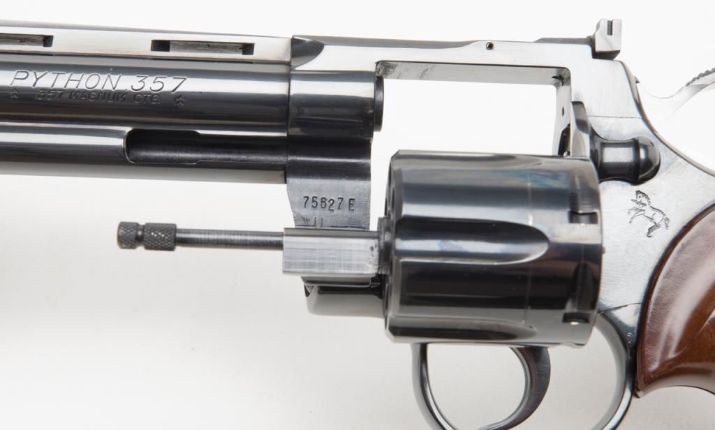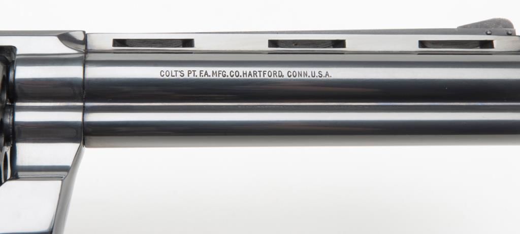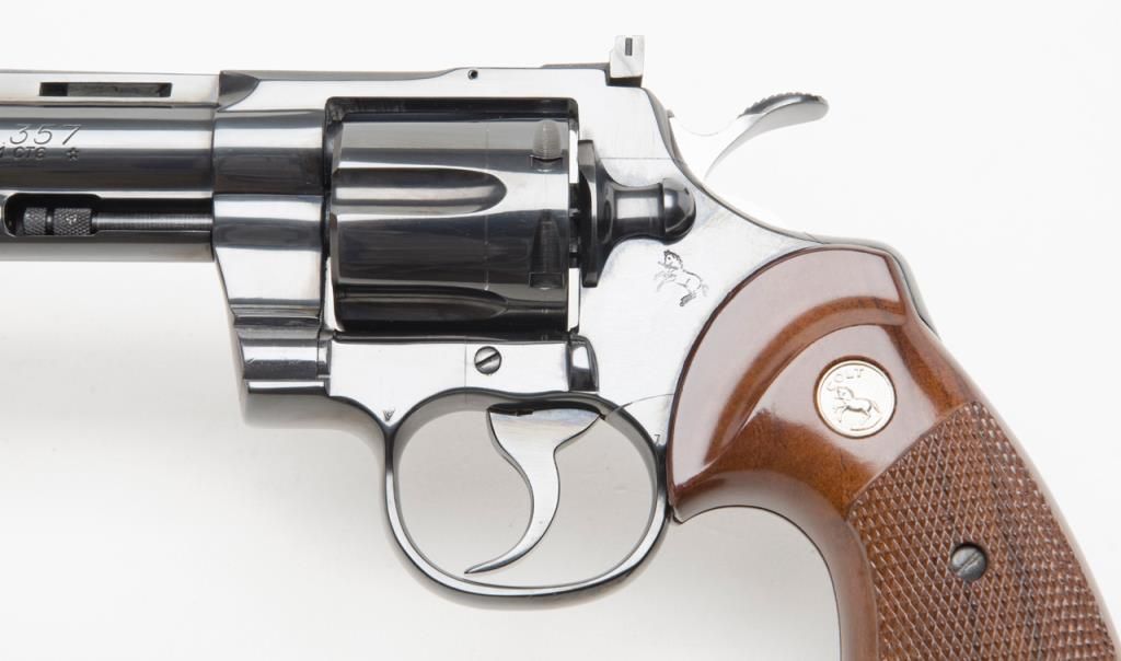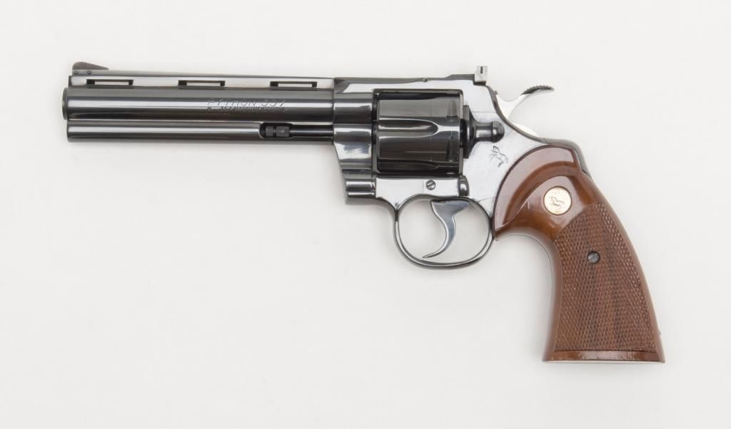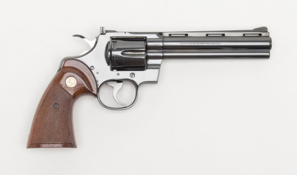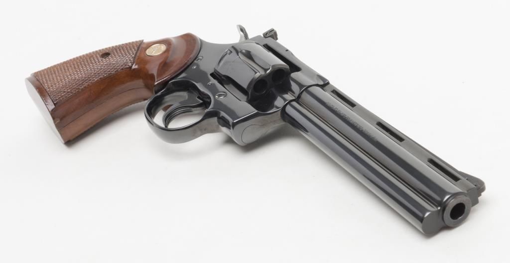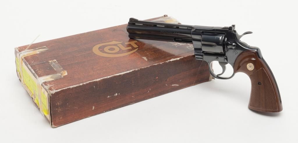 Colt Python DA revolver, .357 Magnum cal., 6” barrel, #75627E in Custom Workshop labeled cardboard box. This gun shows almost no use except the cylinder has been scratched by careless rotation of the opened cylinder against the frame screw head, otherwise, 99%; special ordered with a “tuned action”. Est.: $1,400-$2,500.