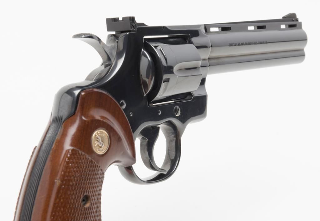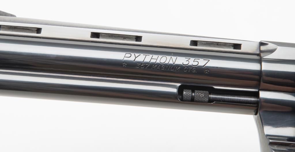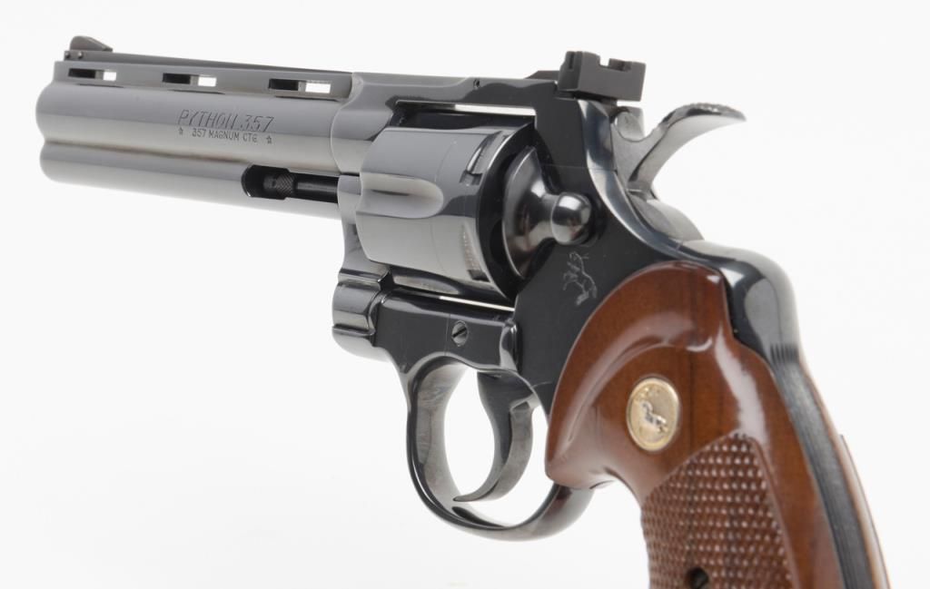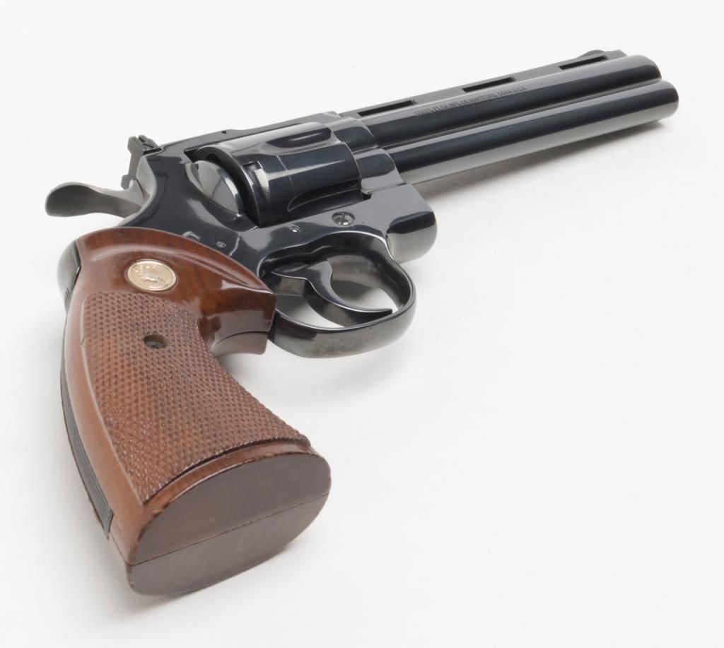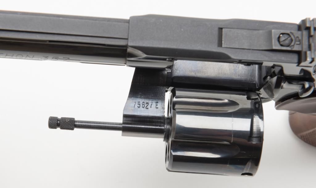 Colt Python DA revolver, .357 Magnum cal., 6” barrel, #75627E in Custom Workshop labeled cardboard box. This gun shows almost no use except the cylinder has been scratched by careless rotation of the opened cylinder against the frame screw head, otherwise, 99%; special ordered with a “tuned action”. Est.: $1,400-$2,500.