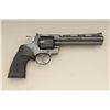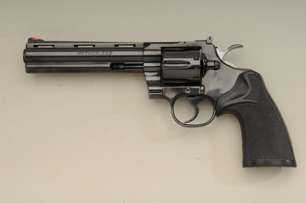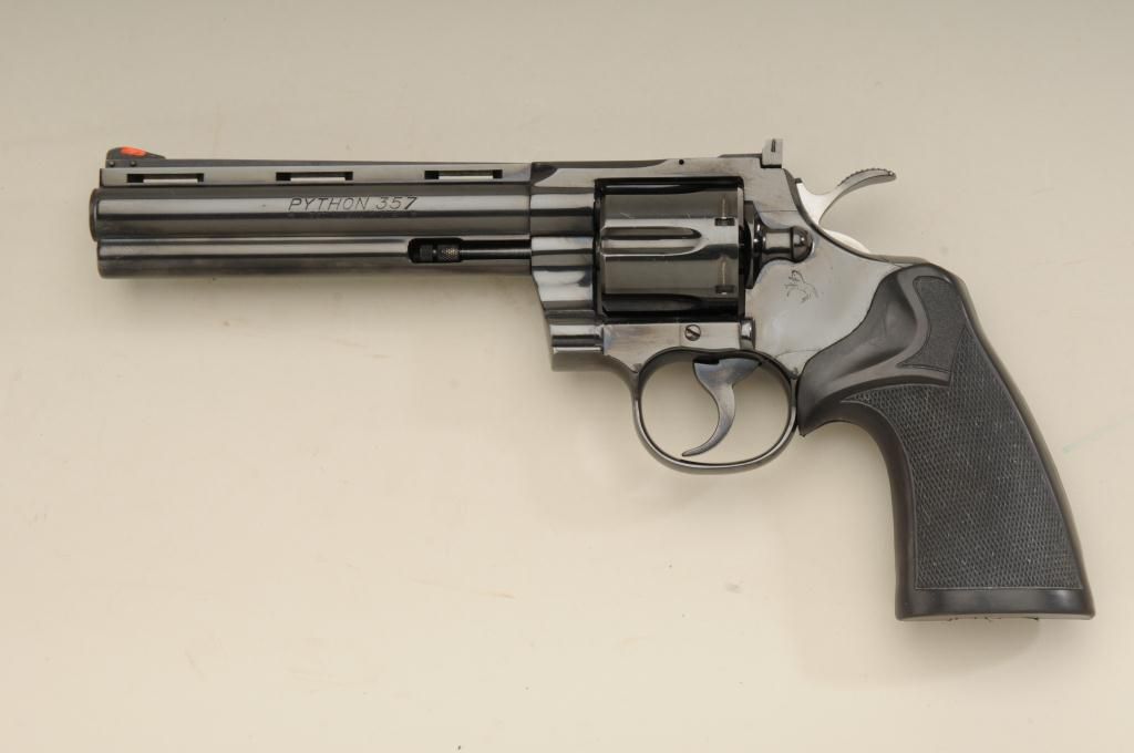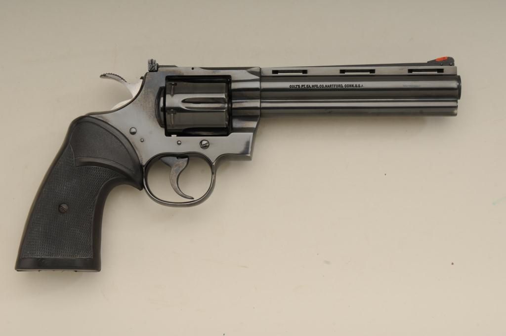 Colt Python DA revolver, .357 Magnum cal., 6” ventilated rib barrel, blue finish, Pachmayr checkered combat hard rubber grips, #93954E, with wood grained cardboard box, insert and instructions. This gun is in overall finecondition showing the majority of its original finish, fine bore, action, markings and very good after market grips; box is somewhat tattered and discolored with one end piece missing. Est.: $900-$1,800.