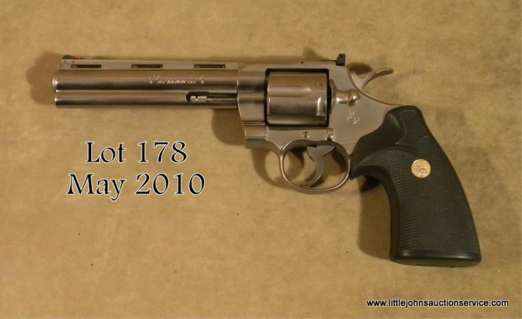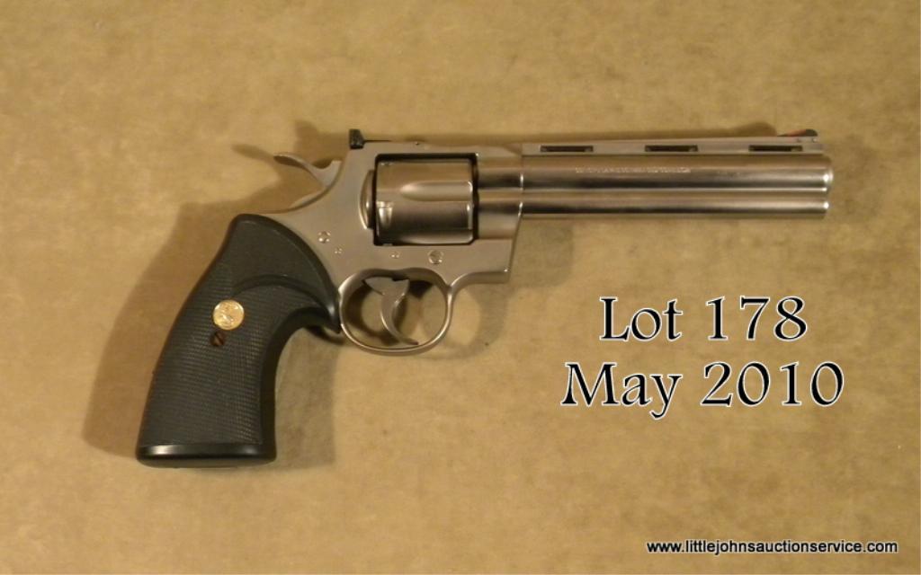 Colt Python DA revolver, .357 Magnum cal., 6” ventilated rib barrel, satin stainless steel construction, Pachmayr checkered black medallion hard rubber combat grips, #66134. This gun is in overall excellent condition showing sharpmarkings, excellent bore, crisp action, adjustable rear sight, red insert front fixed sight and very good grips. Est.: $400-$800.