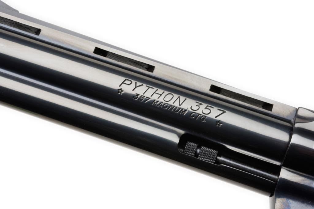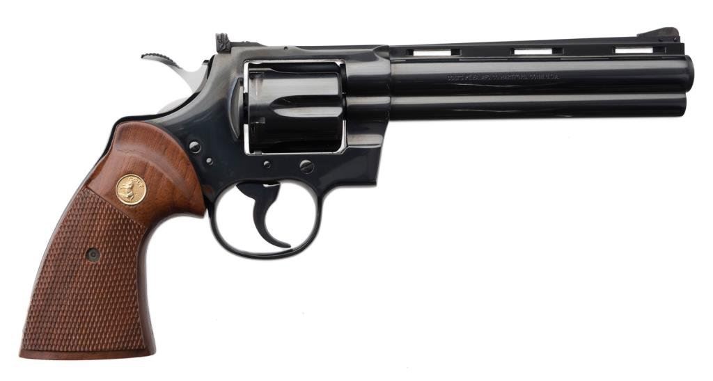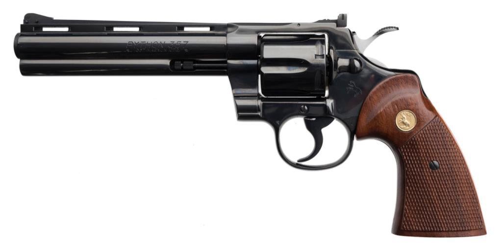 *Colt Python DA revolver, .357 Magnum caliber, 6” ventilated rib barrel, S/N K79223, in excellent condition showing little handling. Est.: $1,500-$3,000.