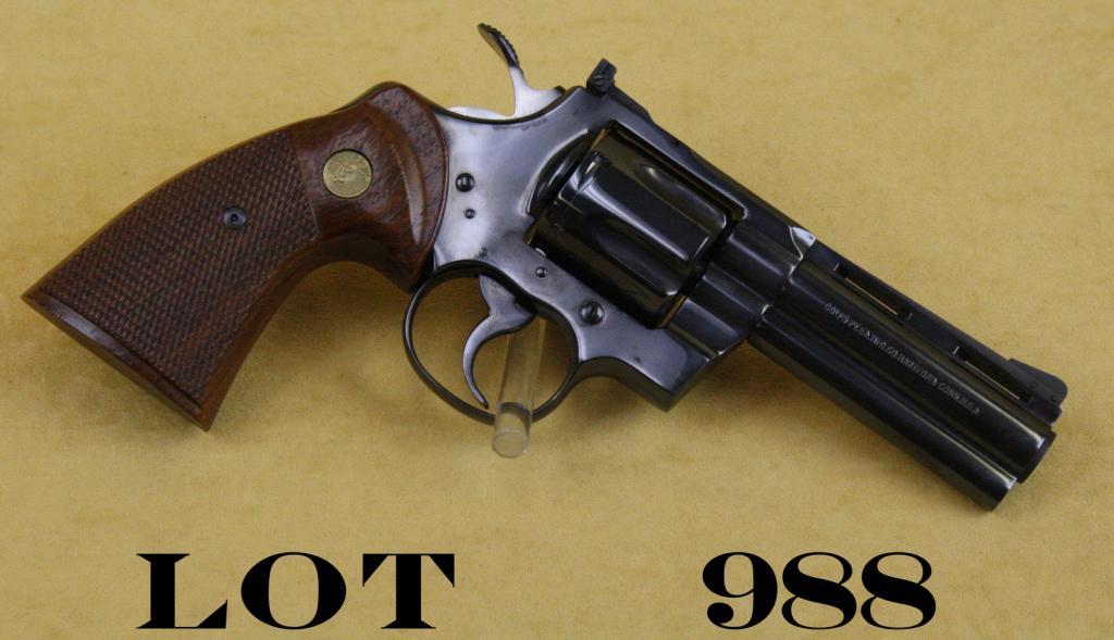 Colt Python DA revolver, .357 magnum cal., 4” barrel, blue finish, checkered wood medallion combat grips, #V13650. This gun is in fine condition showing approx. 99% original blue finish, excellent bore, actionand markings; excellent grips. Accompanied by a Protector brand black plastic padded carry case. Est.: $600-$1,200.