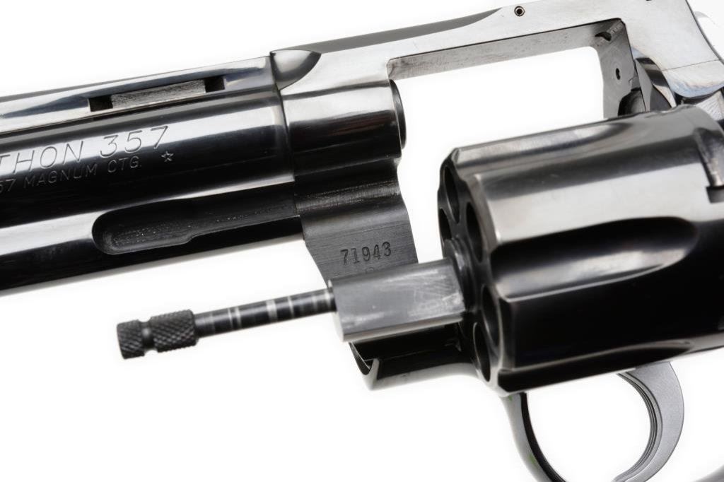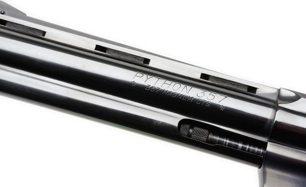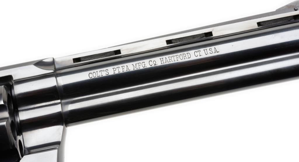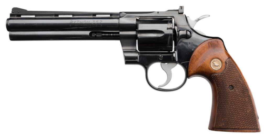 *Colt Python DA revolver, .357 magnum caliber, 6” ventilated rib barrel, S/N 71943, (ca 1967), finely re-finished blue, checkered wood medallion grips in overall very good to fine condition as re-finished, crisp action and markings, fine bore, very good to fine grips. Est.: $1,400-$2,800.