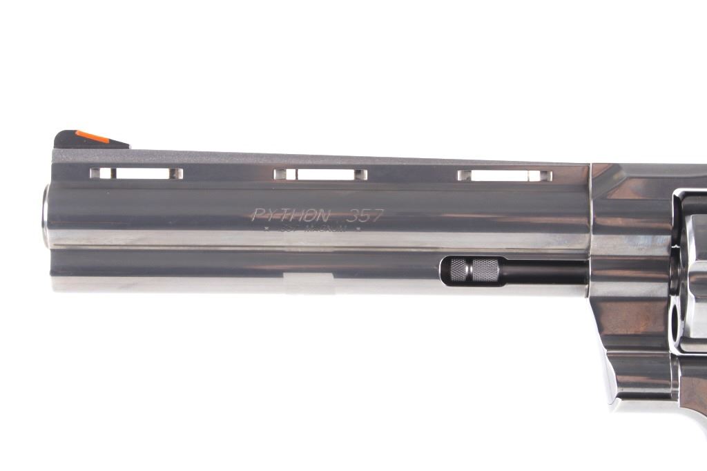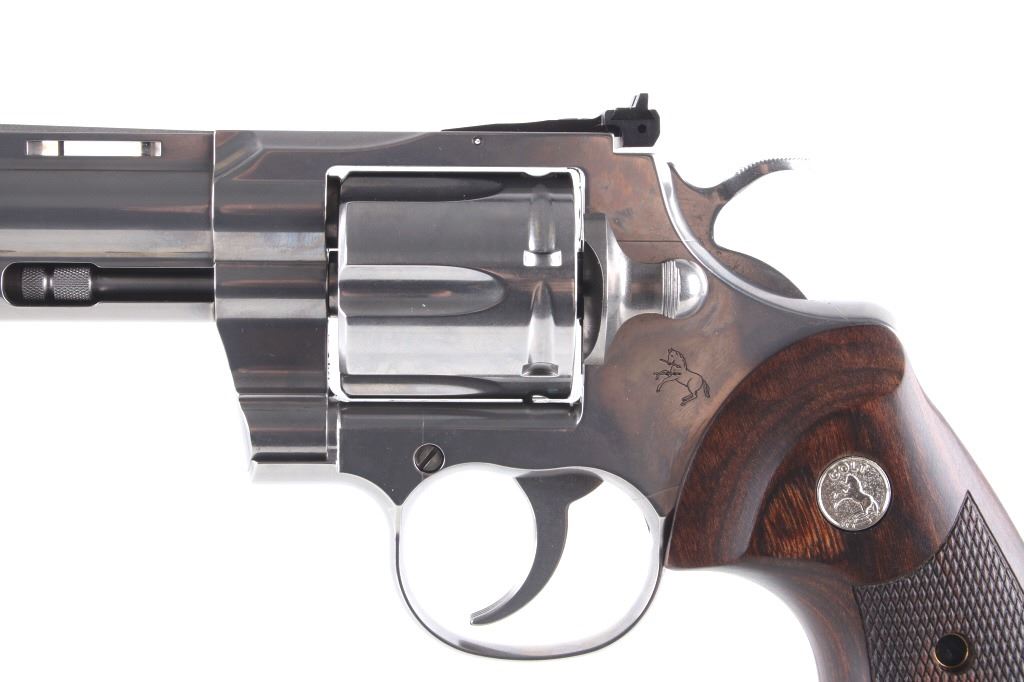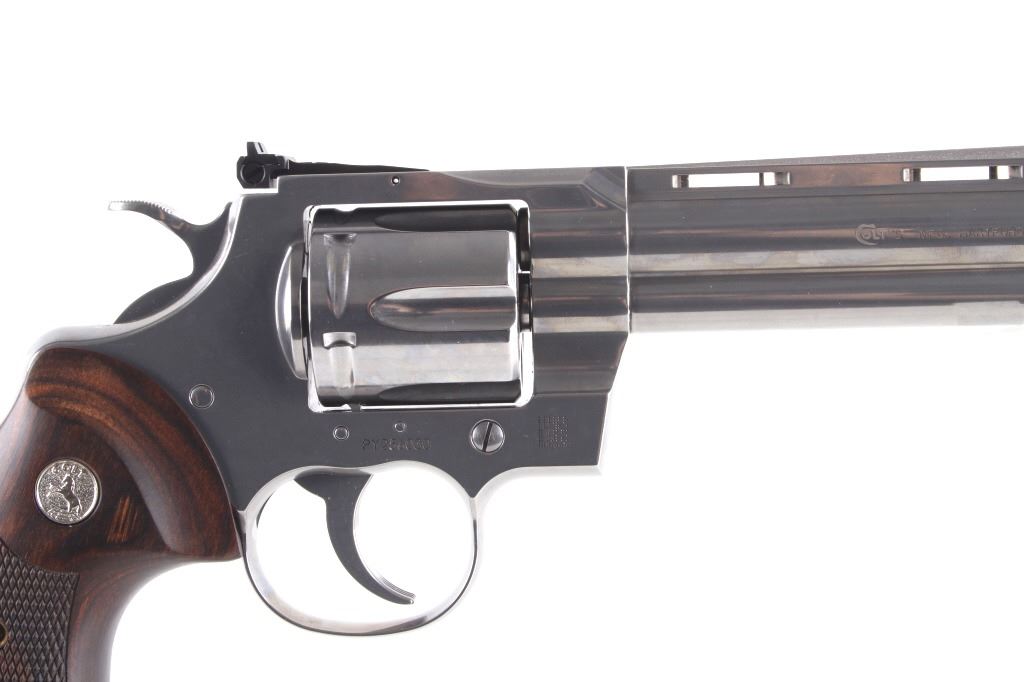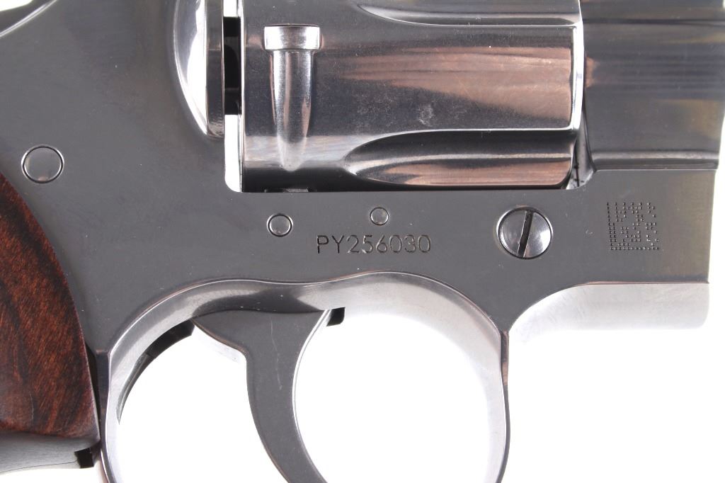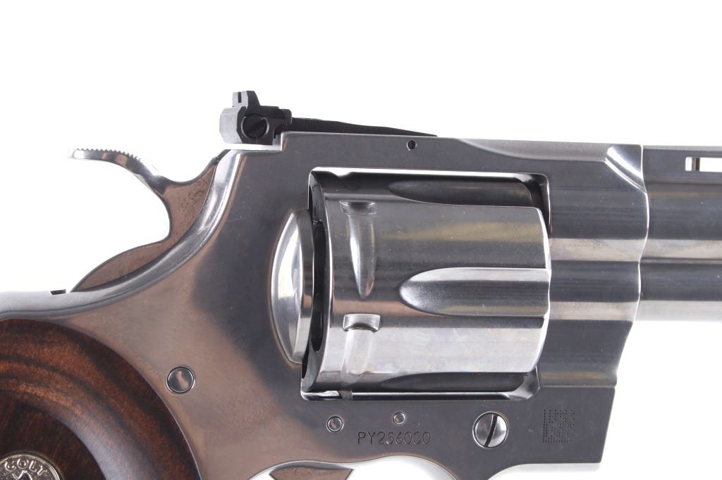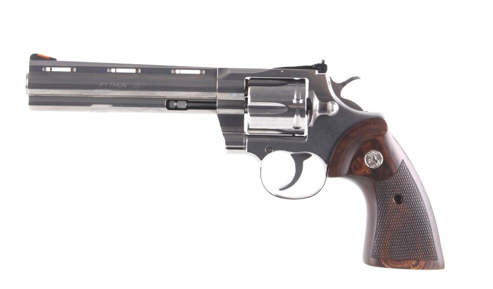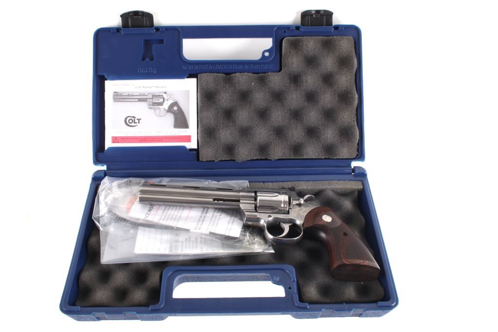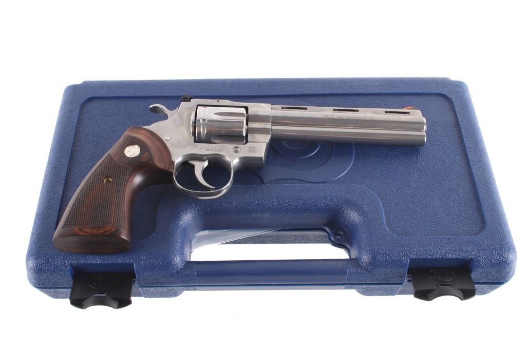 Featured in this lot we have a near mint Colt Python double action revolver chambered in .357 Magnum and comes with its original carry case box. This iconic revolver is built on Colt's large I-Frame, and is finished in Colt's Stainless steel, contrasted by dark laminate grips, adorned with the Colt crest. Additionally, the revolver comes with a 6", full solid underlug barrel, full top rib, and adjustable rear sight. The Colt Pyhton was introduced in 1955, intended for Colts "premium market segment". Supporting that claim - Firearm collectors and writters such as Jeff Cooper, Ian V. Hogg, Chuck Hawks, Leroy Thompson, and many more described the Colt Python as "the finest production revolver ever made", while official Colt historian - RL Wilson describes the Python as "the Rolls-Royce of Colt Revolvers". This revolver is marked across the left side of the barrel reading "PYTHON 357 * .357 MAGNUM *. and marked on the right side reading "COLT'S MFG. HARTFORD, CT USA". The revolver show like new quality with little to no wear across the piece and mechanically smooth actions. The revolver comes with its original Colt hard plastic carry case, manual, and gun lock. This wonderful revolver and its case weigh 4lbs 12oz in total. Serial Number: PY256030. This is a modern firearm and requires a FFL transfer or NICS background check.