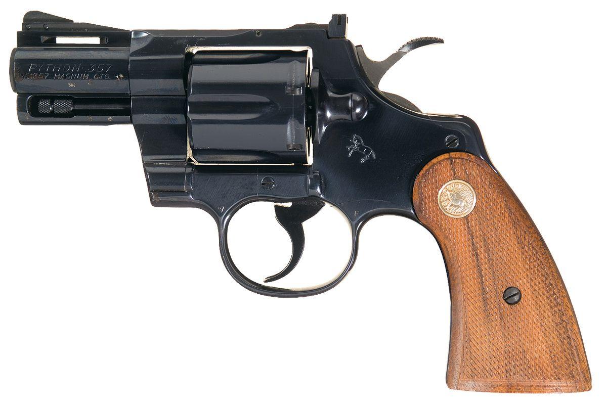 This Colt Python revolver is fitted with a scarce 2 1/2" vent rib barrel. The sides of the barrel have the standard markings and the Rampant Colt logo is marked on the left side of the frame. The revolver is equipped with a ramp front sight and adjustable rear target sight, serrated trigger and backstrap, checkered hammer with polished sides and fitted with the correct two piece checkered "service" grips found on the 2 1/2" variation.