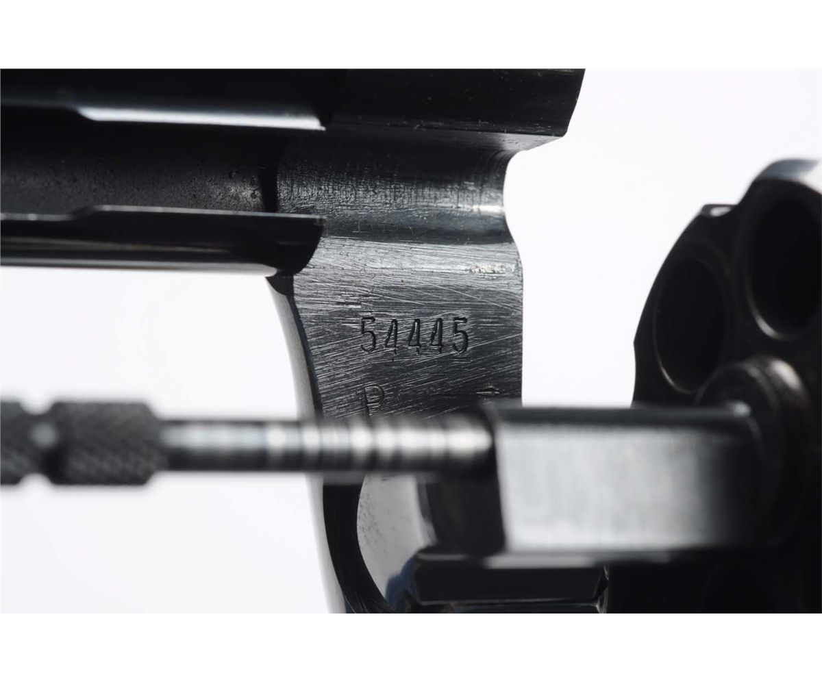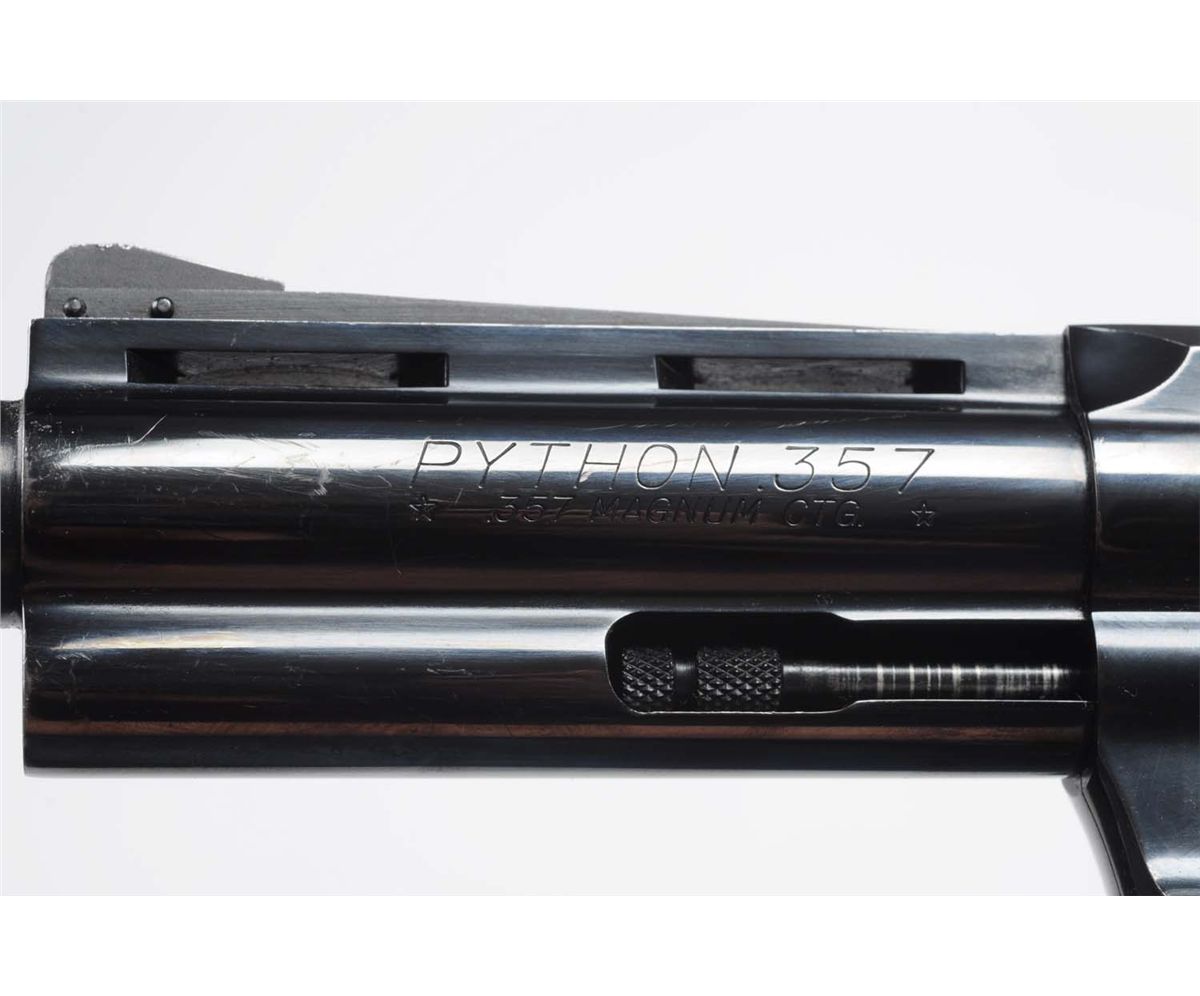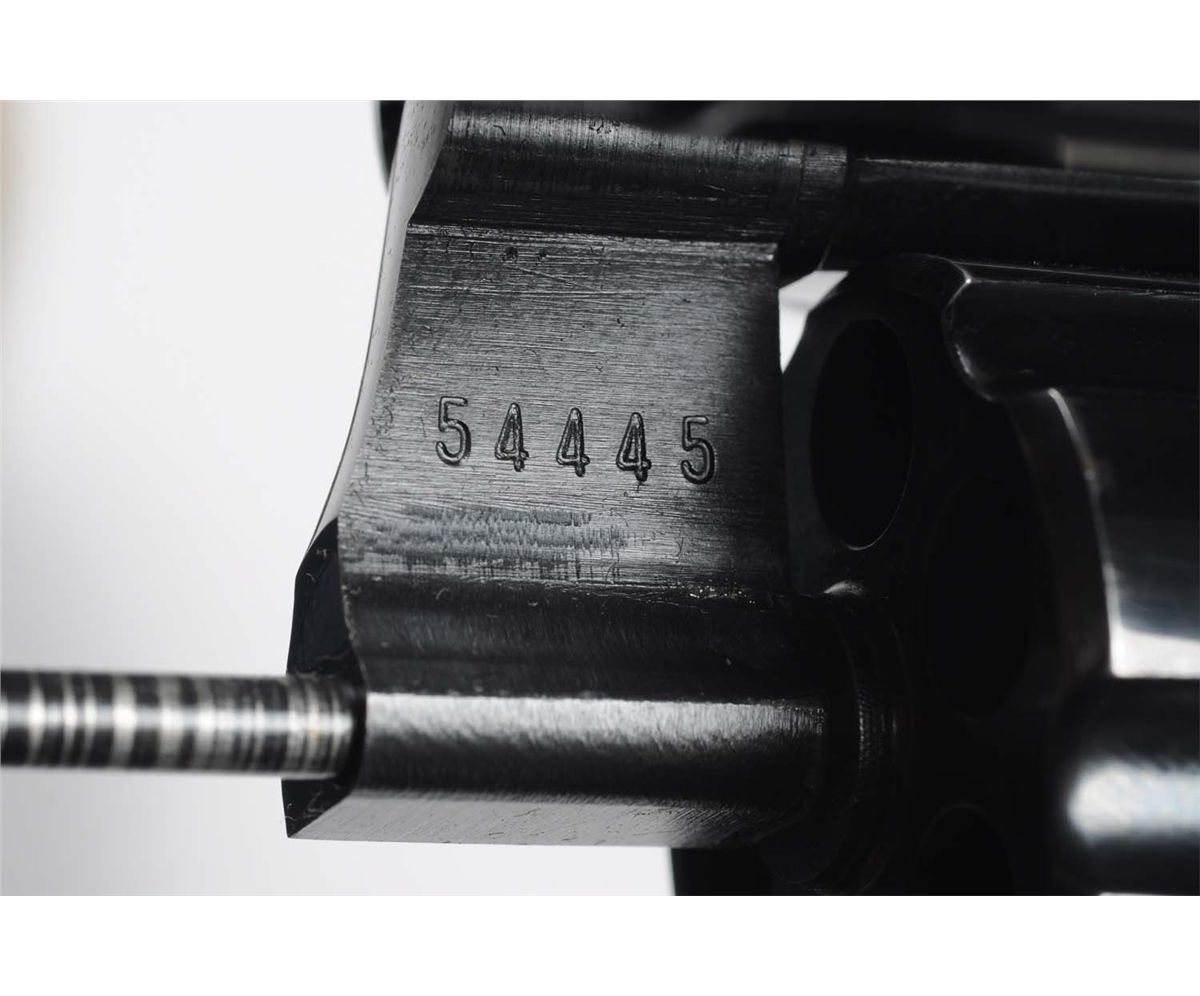 Serial # 54445 Manufactured in 1966. Standard features include a 4" barrel, full, lug, vent rib, double action, blued finish, target hammer, target sights, checkered walnut grips, .357 magnum, and gold medallion grips. Revolver retains approximately 97% original factory blue finish, but has been used or carried. There is wear on high edges and light drag line. Mint bore and action. Nice shooter grade Python.