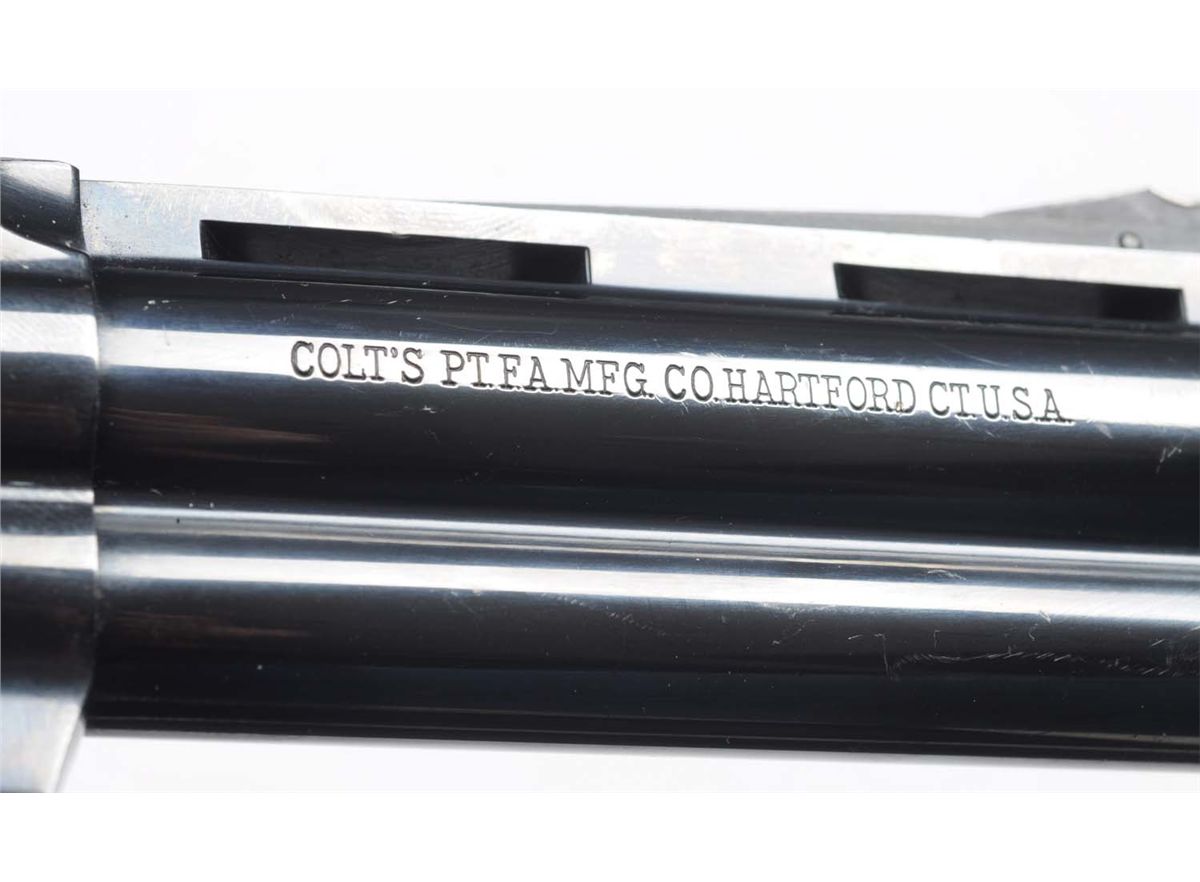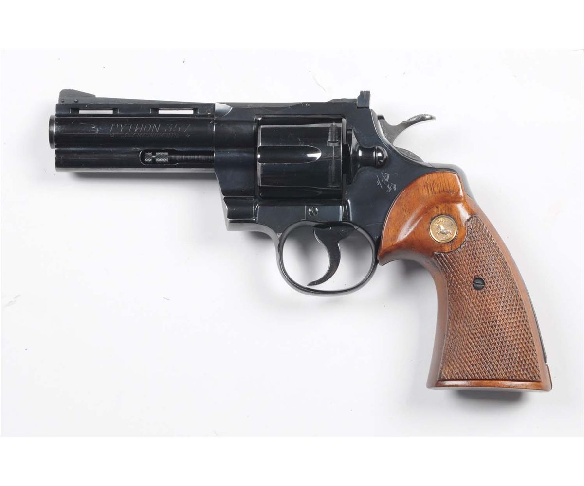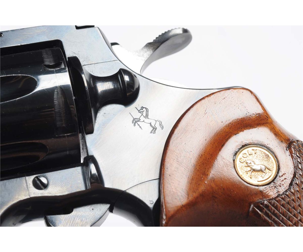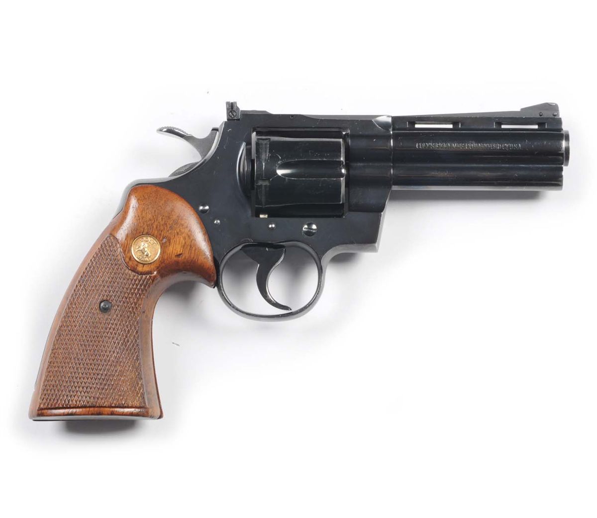 Serial # 54445 Manufactured in 1966. Standard features include a 4" barrel, full, lug, vent rib, double action, blued finish, target hammer, target sights, checkered walnut grips, .357 magnum, and gold medallion grips. Revolver retains approximately 97% original factory blue finish, but has been used or carried. There is wear on high edges and light drag line. Mint bore and action. Nice shooter grade Python.