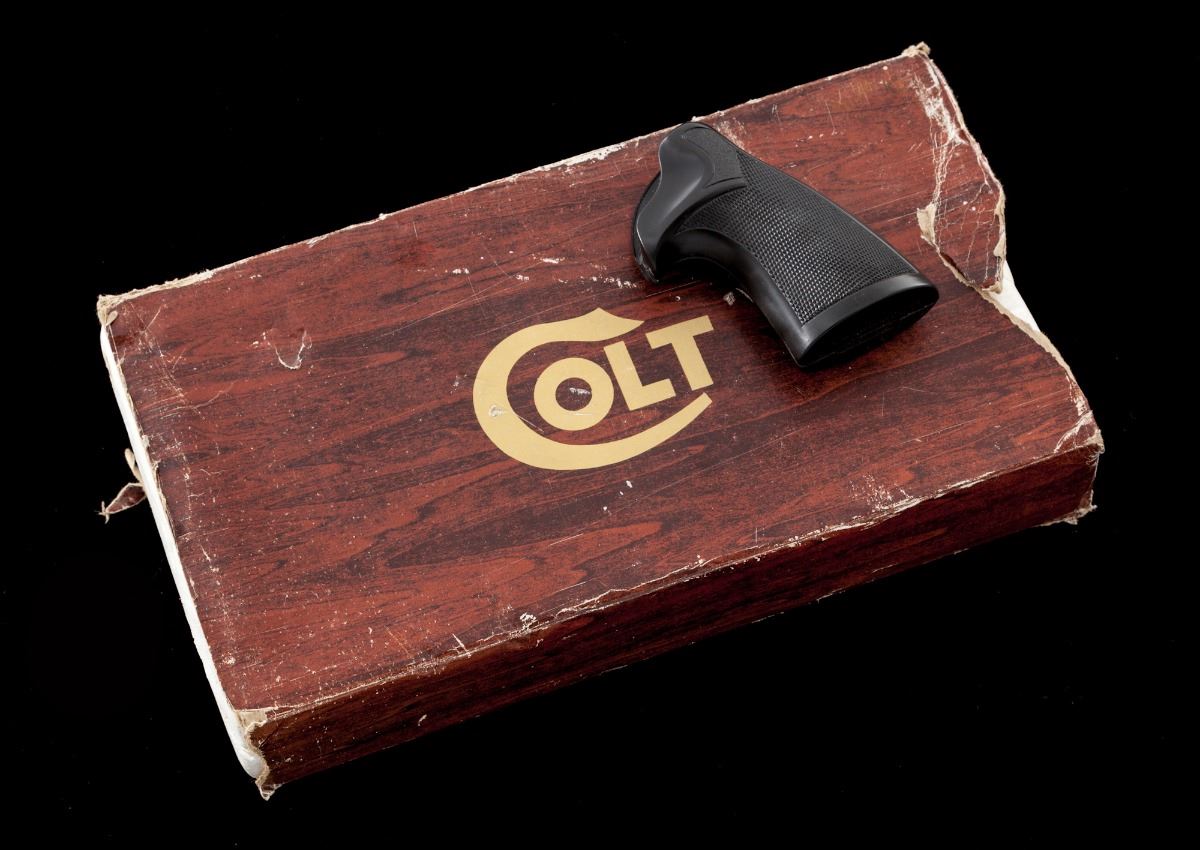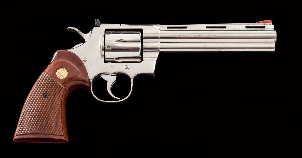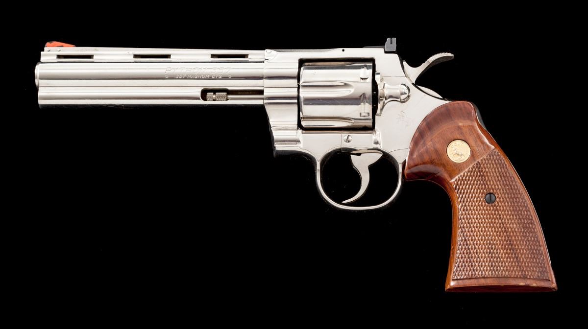 Colt Python Double Action Revolver, #V41967, .357 mag. cal., 6'' vent rib barrel, nickel finish, checkered walnut grips with inlaid Colt medallions, pinned ramp front sight, adjustable rear sight, in Colt woodgrain box with fitted Styrofoam insert, and extra pair of hard rubber Pachmayr grips. Condition is very good with a substantial amount of fine to moderate scratches to nickel finish. Wood grips with light impressions, wear to bottom edge, and crisp checkering. Front sight with added orange paint. Action is crisp, bore is bright and in excellent condition. Box is missing end flaps and shows considerable wear. Est.: $1,750-$2,250. (Modern) (PPT)